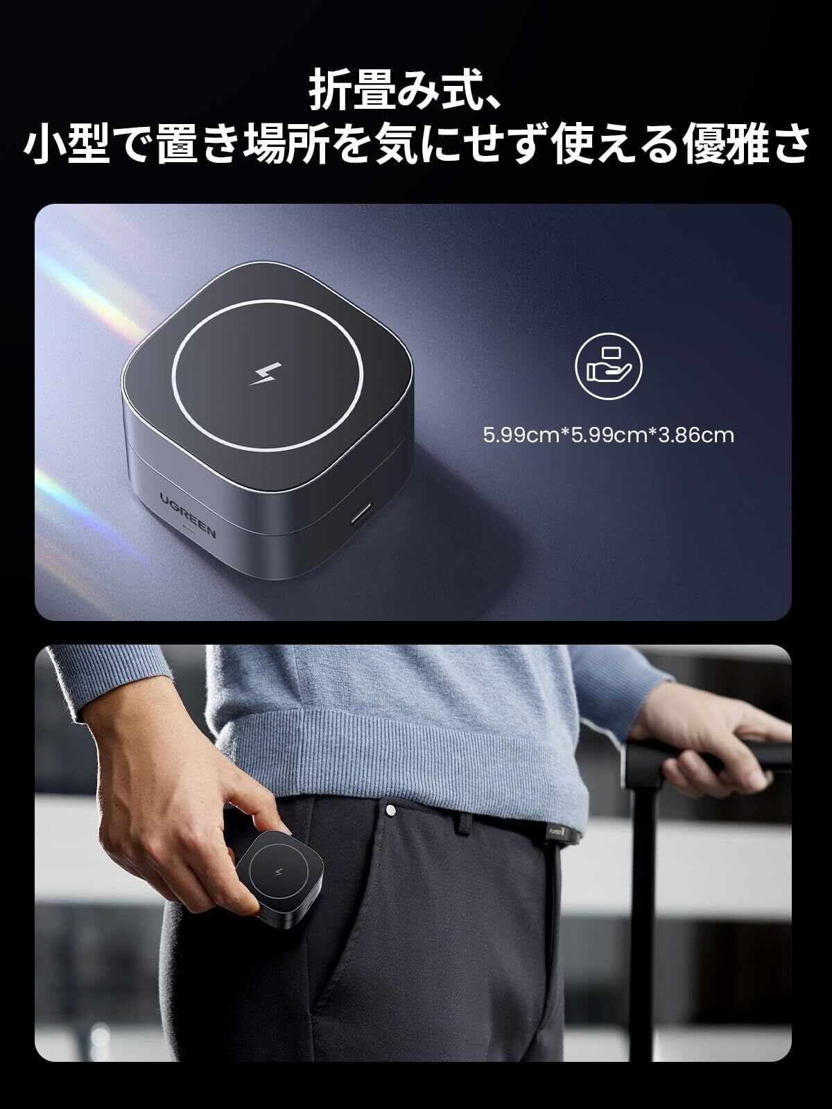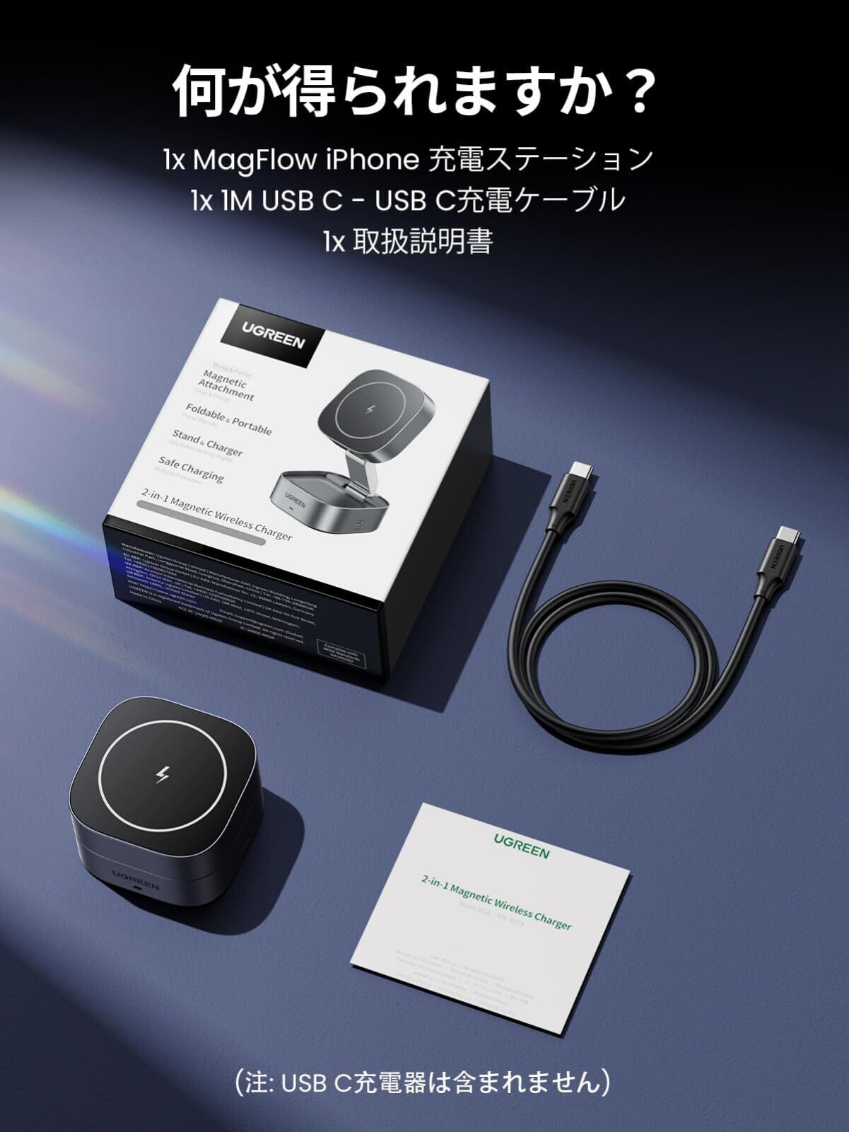 UGREEN MagFlow ワイヤレス充電器 2in1 magsafe対応 折りたたみ式 マグセーフ 充電スタンド 7.5W iPhone 16/16 Plus/15 Pro/15 Pro Max/14/13/12 シリーズ、AirPods 3/2/Pro など 2USB Cポート(USB C充電アダプタなし)