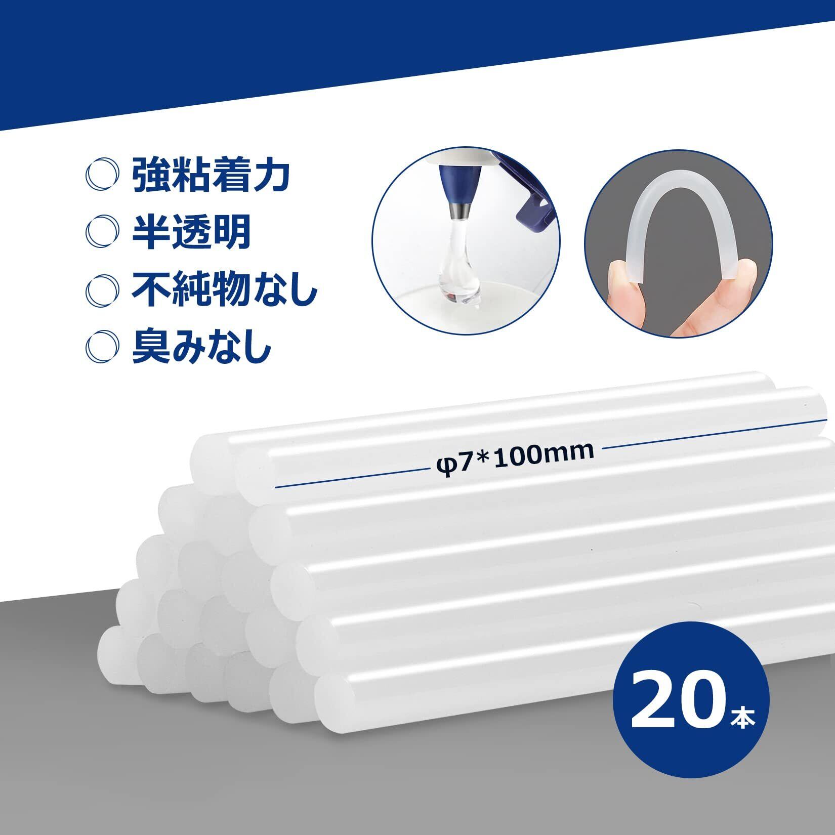 【グルーガンスティック 20本付属】20本の専用グルースティックが含まれています。サイズ:φ7x100mm。強力な接着剤のため、粘着力を持ちつつ、環境に優しくて臭みもありません。半透明で目立たなくて金属、木材、布地、プラスチック、セラミックスなど色な素材同士をくっつけて、様々な接着作業に向いています。