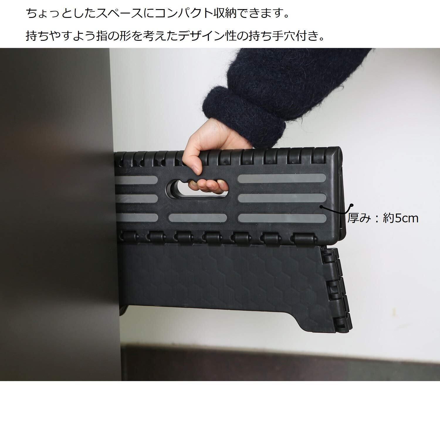 【サイズ・素材・色】:使う場合 開いた状態 (約)幅38×奥行22×高さ13cm(ご注意:高さは10cmではありません。天板中央には乗らないでください。) 折り畳み 閉じた状態: (約)幅40×高さ24×厚さ5cm、重さ(本体):約1200g、メイン素材:プラスチック、色:黒色、 滑り止め付き 改良点:両サイドの内側に折りたたむ箇所を筒型形状へ、また天面にあたるツメ幅を約1.4cmから約1.9cmへ長くすることでより安定感がアップしました。 静耐荷重:約100キロ【ご注意】中央部は持ち手を考慮した構造の踏み台となります。持ち手部分は乗らないでください。表示の数値は静荷重による耐荷重負荷試験の数値となります。衝撃力を考慮したものではありません。静耐荷重以上の荷重をかけたり、耐荷重以内での急な衝撃は与えたりしないでください。耐荷重の数値は測定値のため保証値ではありませんことをあらかじめご了承願い願います。踏み台に上方から天板へ飛び降りること、イスとして使用すること等は危険ですのでおやめください。添付の取扱説明書をお読みの上適切にお使いくださいませ。(※2024年7月静荷重 品質検査済み)