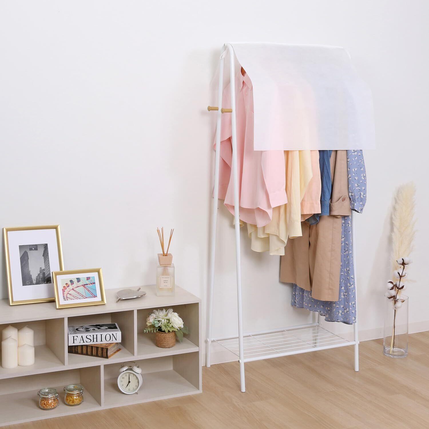 【被せるだけの衣類のホコリ除けカバー】:クローゼットやハンガーラックに掛けた衣類をまとめてホコリから守るカバー。
