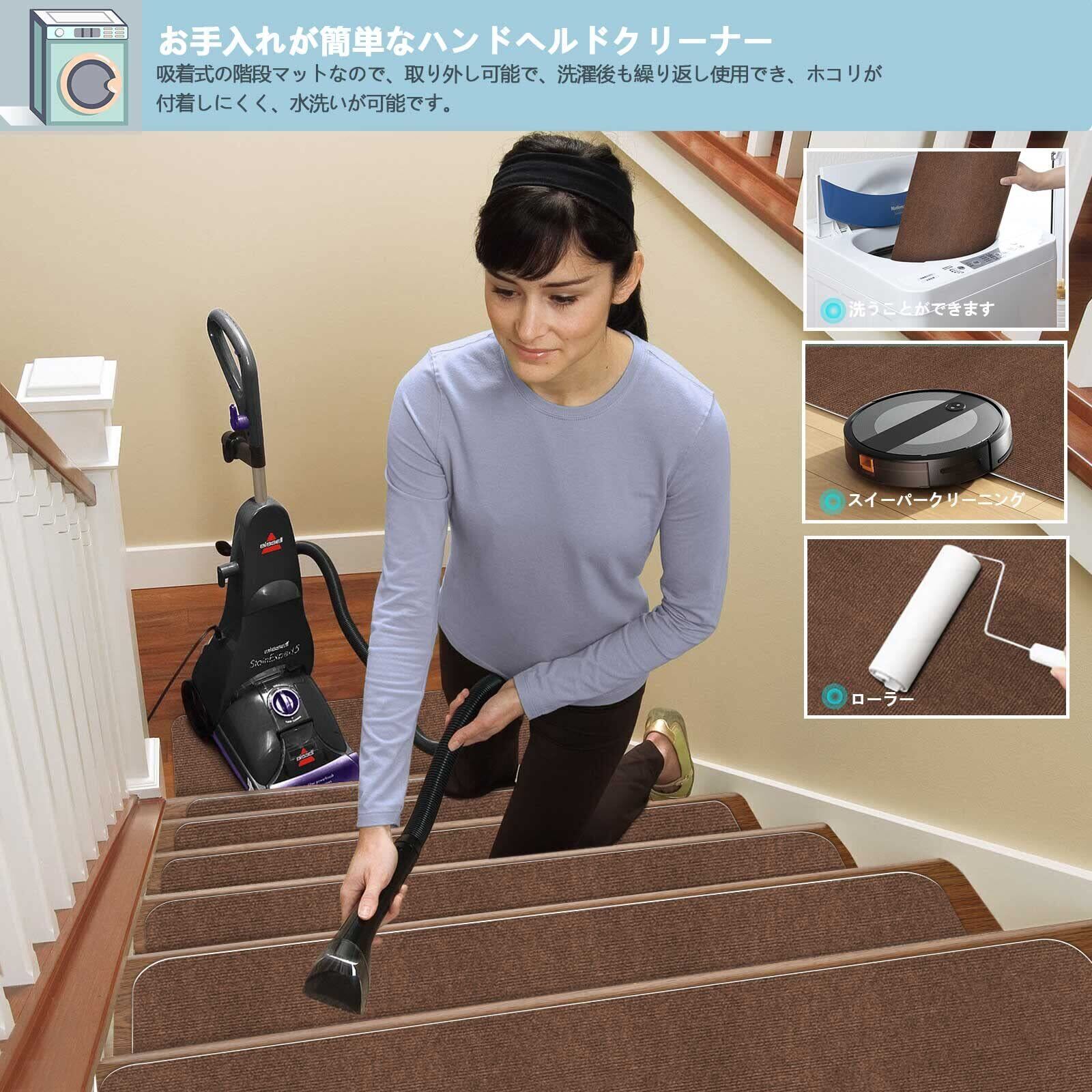 【清潔しやすく、繰り返し使用可能】使い方:床掃除後、製品の下のフィルムをはがして、マットを片側から押し上げ、階段にしっかりと吸着します。 デイリークリーナーでホコリや汚れをしっかりガード。 汚れたら、手洗いまたは洗濯機で洗濯してください。 水で洗える階段マットです。 何度も洗濯して乾燥させて繰り返し使えます。