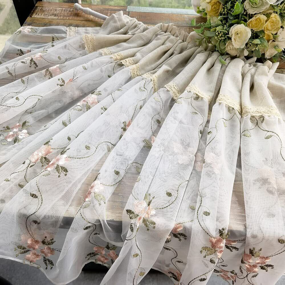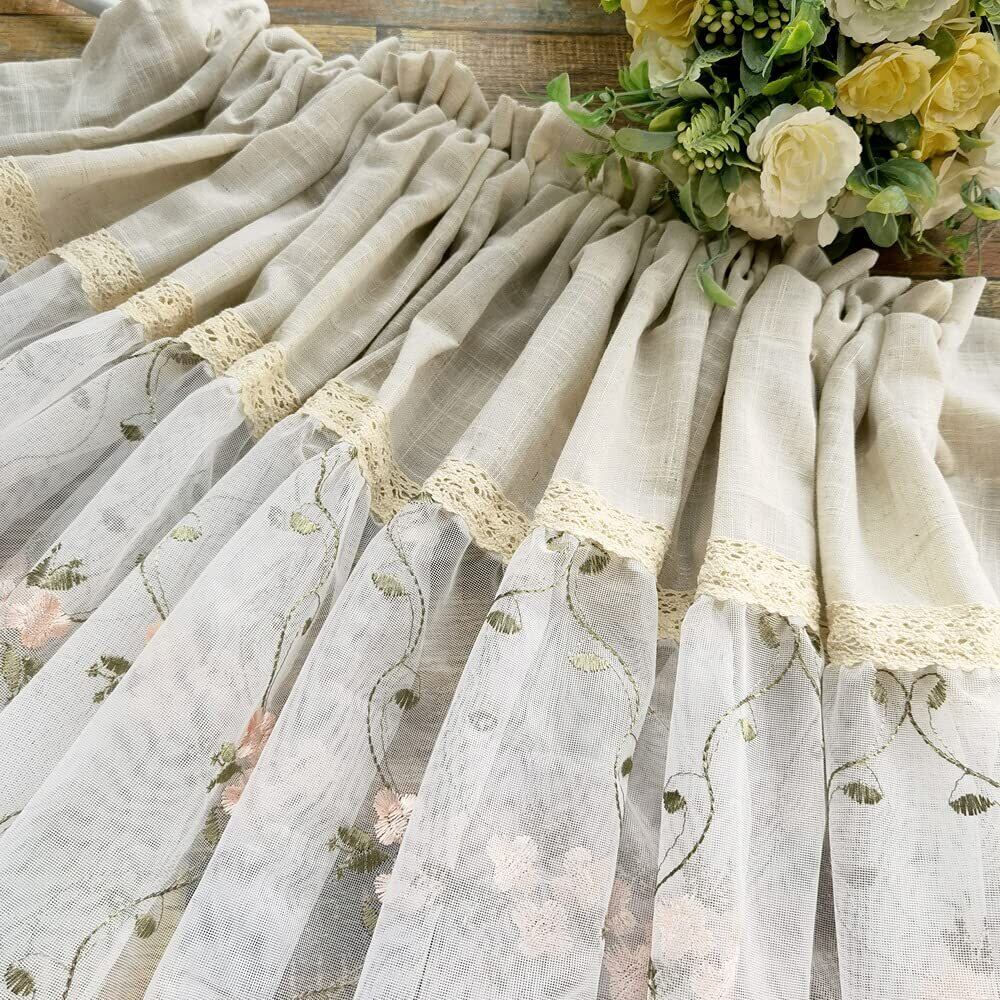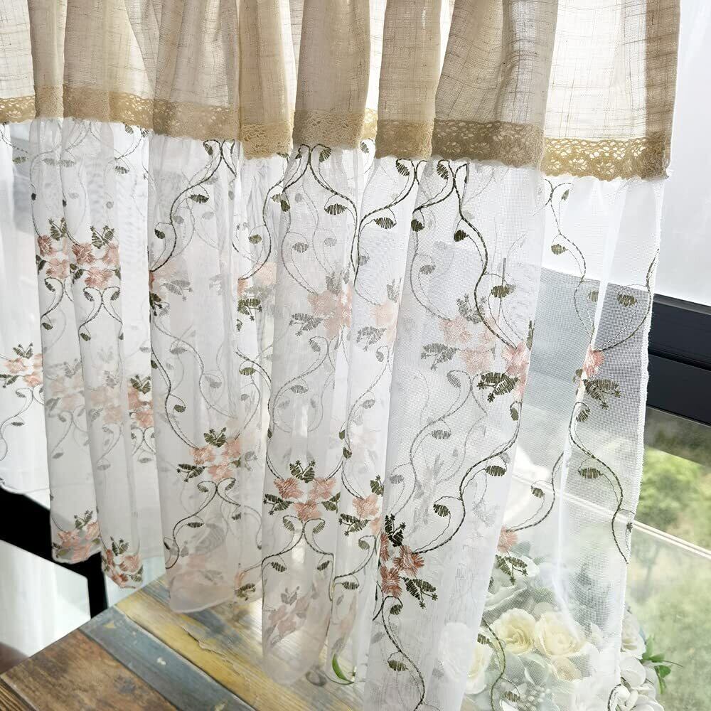 pureaqu ピンクの花柄レースカーテン刺繡カフェカーテン のれんリネン生地 短いカーテンキッチン小窓 お風呂 半窓 洗面所 居間 喫茶店 1個 幅100cm×丈60cm