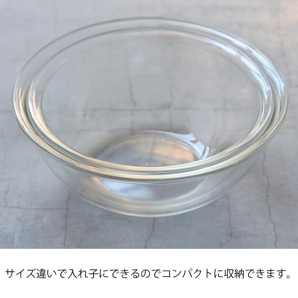 浅型の広口設計なので、こねたり混ぜたりなどの下ごしらえがしやすく、電子レンジやオーブンの調理ができる耐熱ガラス製です。サイズ違いのボールは入れ子収納ができるのでスッキリと置くことができます。