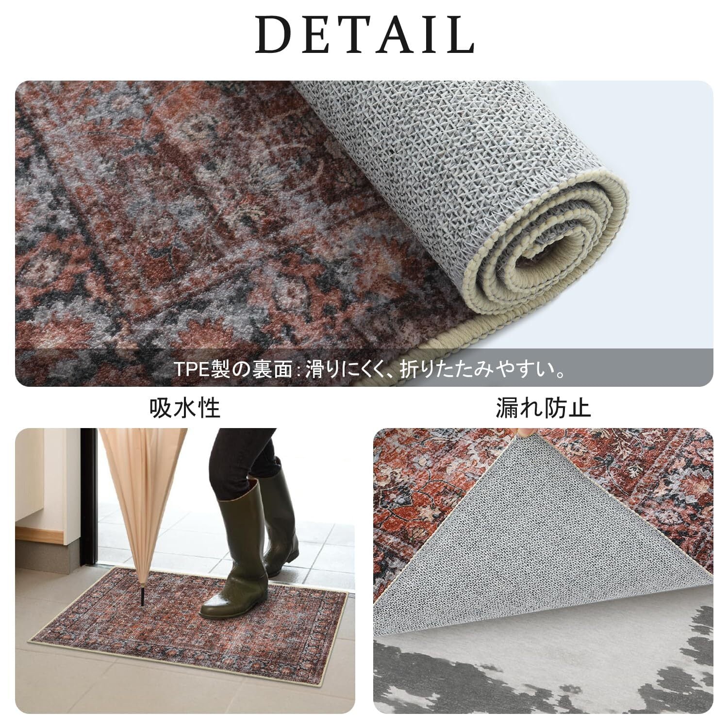 【商品仕様】サイズ:140x200cm、厚さ:約5~8mm、表面素材:100%ポリエステル、低反発カーペット。TPE材質の裏面:滑り止め・水漏れ防止。折りたたみやすくなるだけでなく、折り目も戻りやすくなります。オーバーロック加工の端、遊び毛が出たり、形を崩れたりしにくい。梱包:折り畳み。※裏面に滑り止め加工を施しているため、床暖房の上に直接敷くのはおすすめできません。