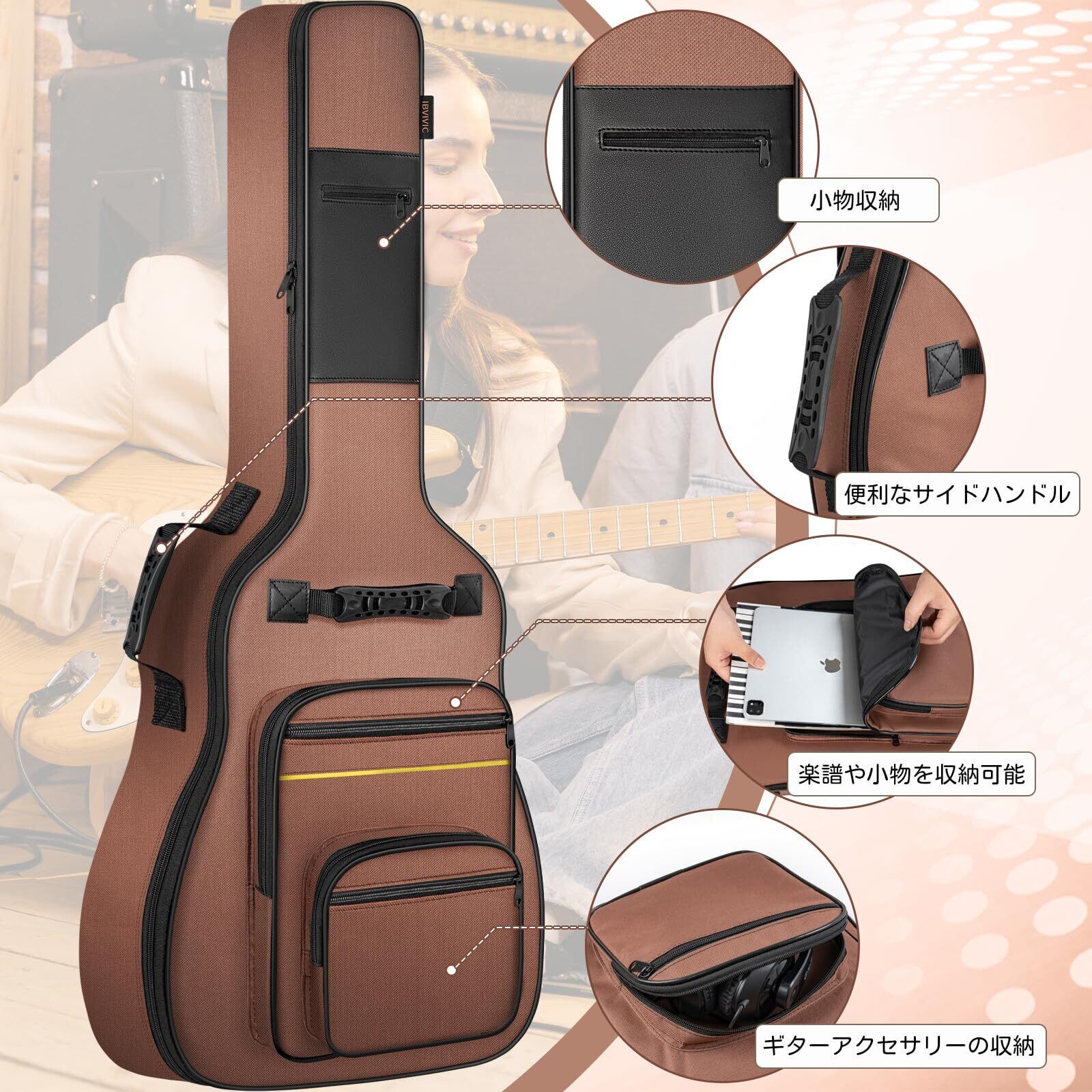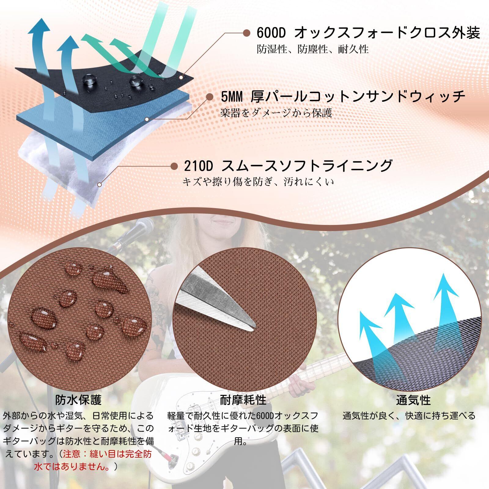 【防水性・保護性】楽器を水や湿気、日常使用による損傷から守るために、このギターバッグは防水性と耐摩耗性を持っています。(注意:縫い目は完全防水ではありません)壁に立てかけて倒れないように、バッグの底部には滑りにくい高品質PP素材のゴムが使用されています。中間層には5mmの衝撃吸収パールウールが使用されており、輸送中の傷や摩耗を効果的に軽減します。