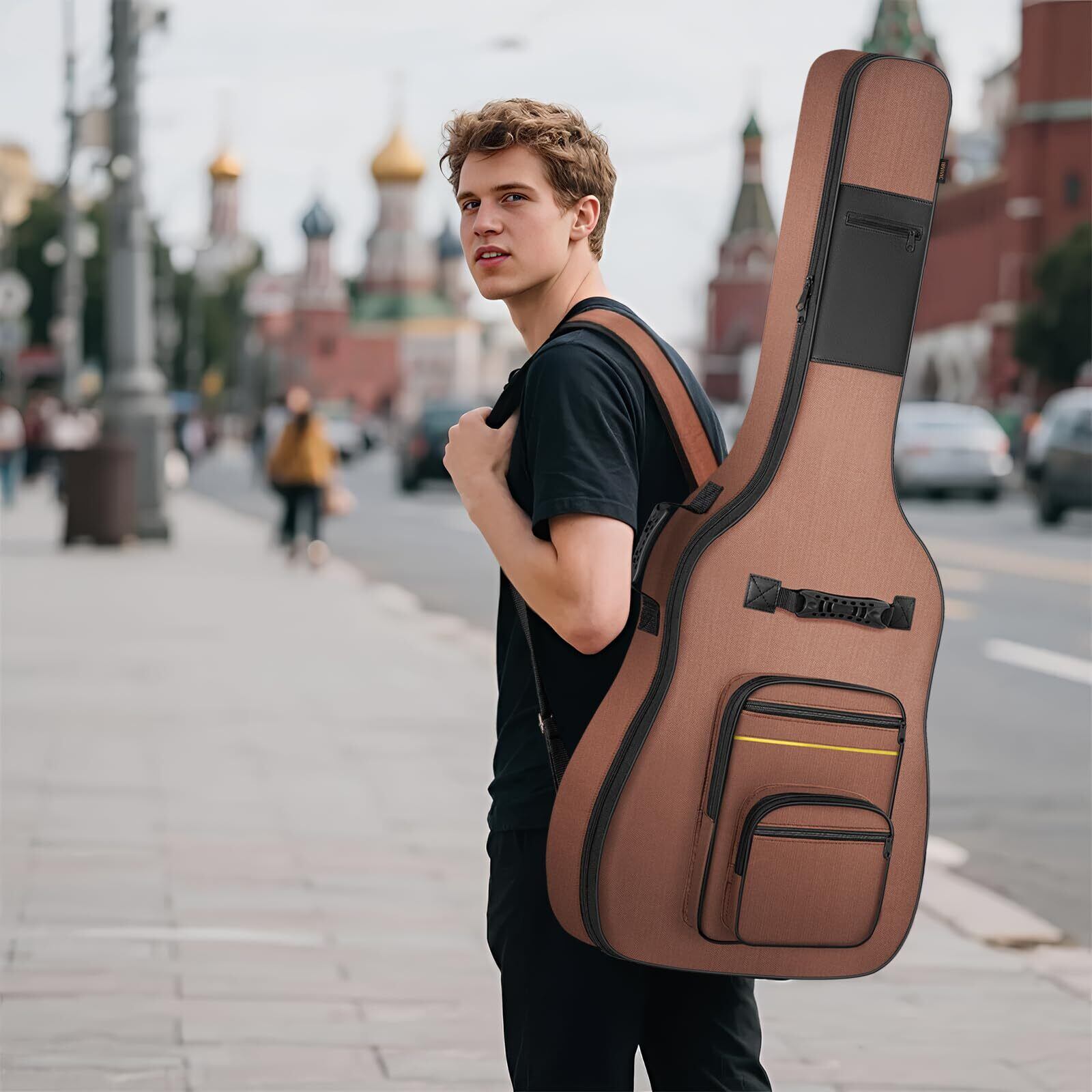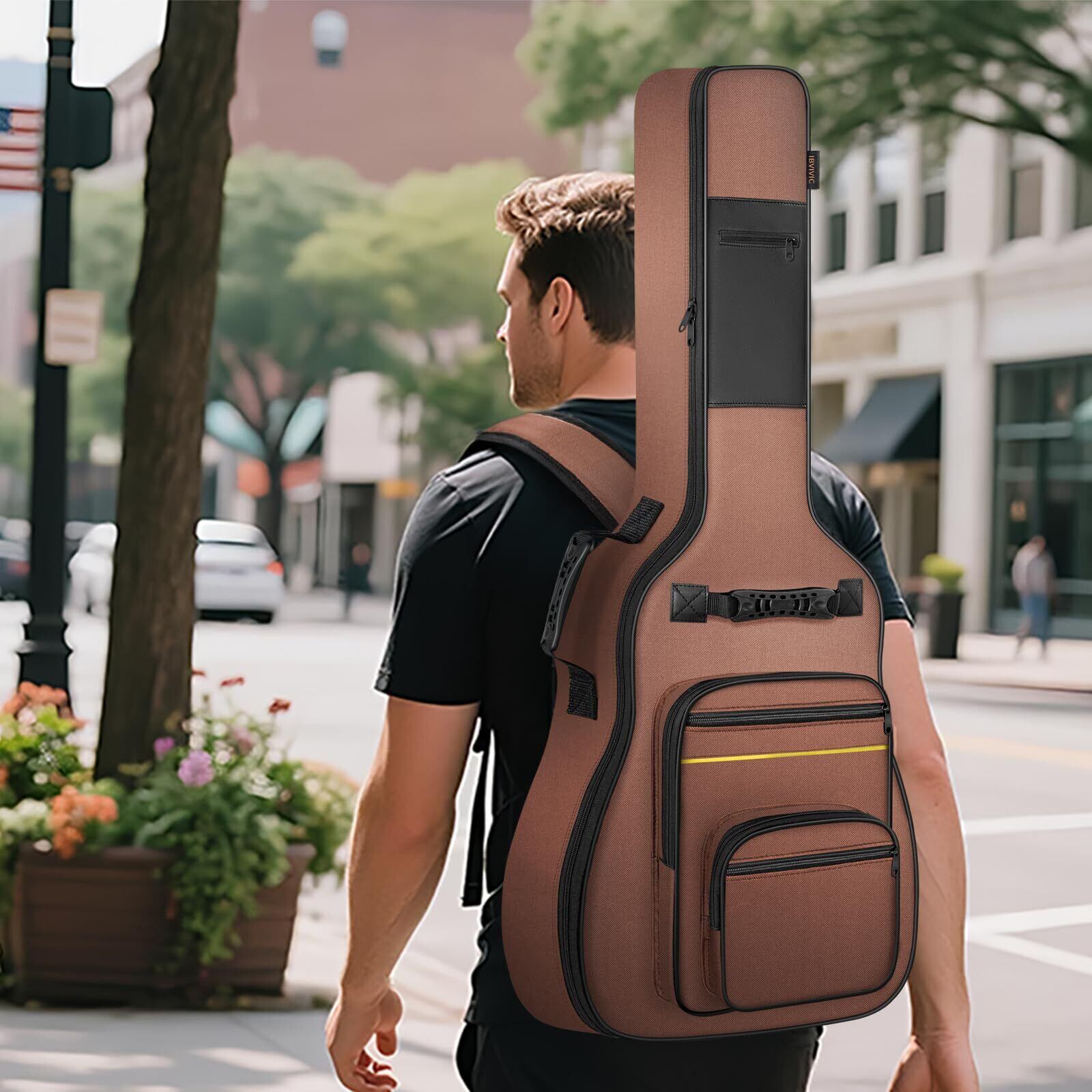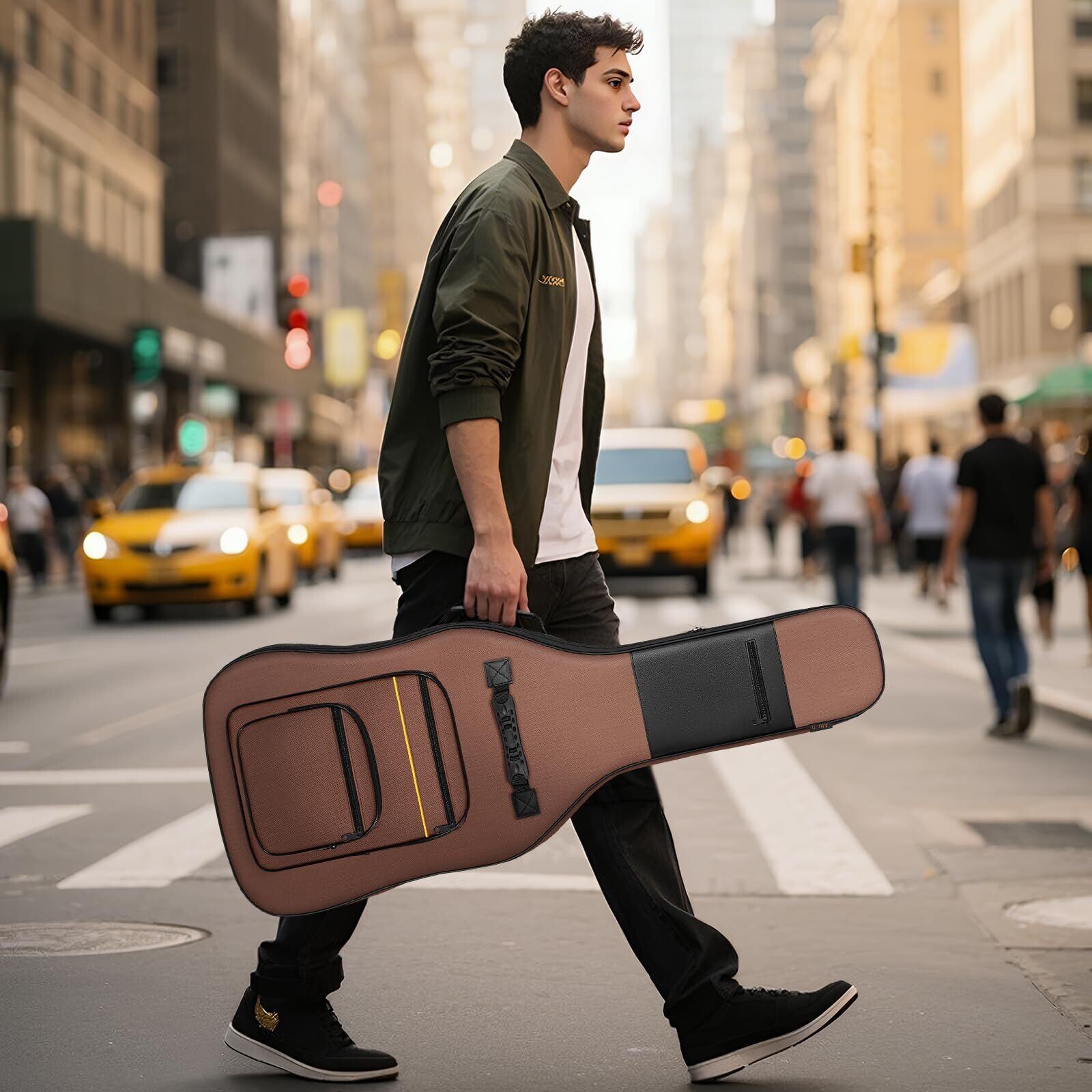 IBVIVIC エレキギターケース ソフト エレキギター エレキベース 軽量 ベース用ギグバッグ 5mmスポンジ ソフト 肩掛け 手提げ 大容量 6ポケット 持ち運びに便利 防水 耐磨耗性 ブラウン(黄色いストライプ付き)