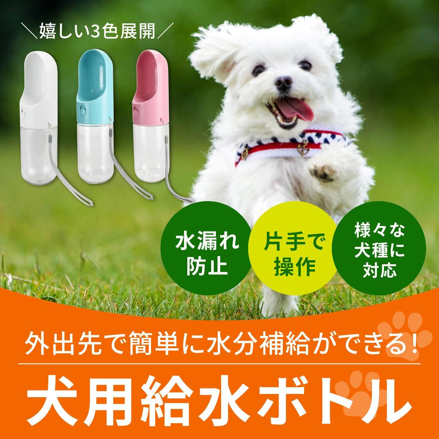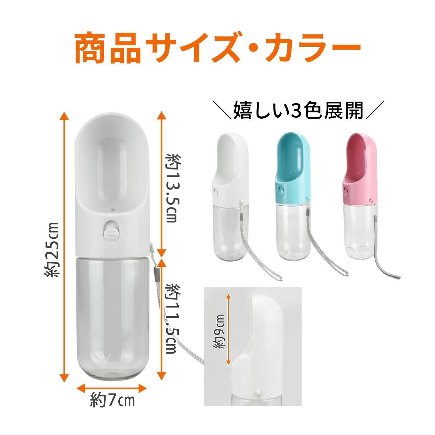 【セット内容】犬用給水ボトル×1点 ストラップ×1本 【サイズ(約)】25cm×7cm 【カラー】ホワイト・ピンク・ブルー ※お好きなカラーをお選びいただけます。【材質】プラスチック 【容量(約)】400ml
