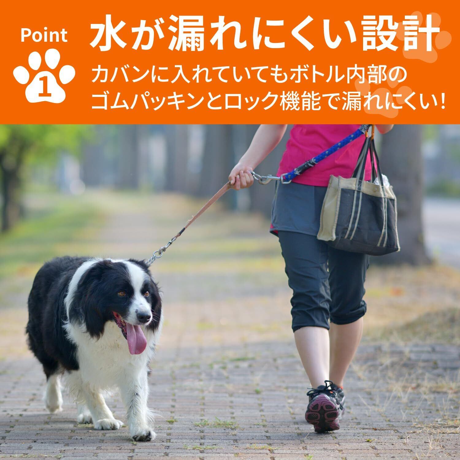 【水漏れ防止機能】ロックボタンとボトル内部にあるゴムパッキンの二重構造により、ボトルが逆さになっても水が漏れにくい設計です。ロックボタンは片手で操作可能なため、反対側にリードを持っている状態でも使用可能。1台でボトルも水飲み皿も完結するので、スムーズに水分補給ができます。