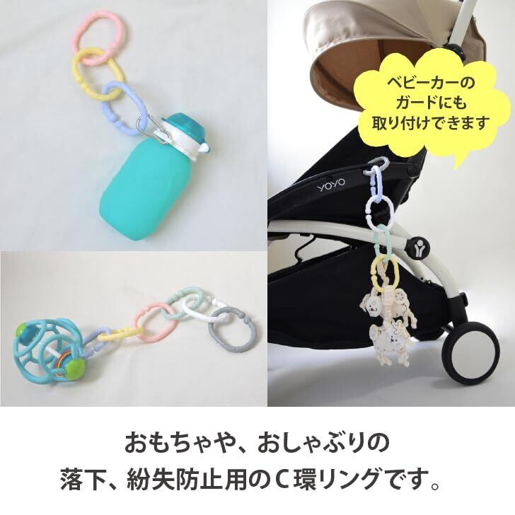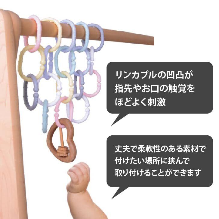 本製品はおもちゃや、おしゃぶりの落下、紛失防止用のC環リングです。開口部を広げて付けたい場所に挟みます。ベビーカーのガードにも取り付けできます。食品衛生法に基づく規格に適合。歯固めとしてもお使いいただけます。リンカブルの凹凸が指先やお口の触覚をほどよく刺激します。丈夫でありながら柔軟性のある素材で作られており、付けたい場所に挟んで取り付けることができます。優しい色合いの6色の18個セット。 ホワイト、パステルピンク、パステルブルー、パステルイエロー、パステルグリーン、パステルグレーの6色が3個ずつ入っています。丸洗できて、お手入れ簡単。