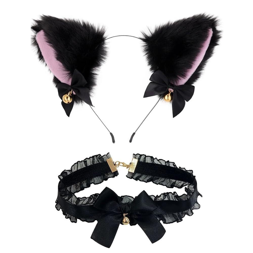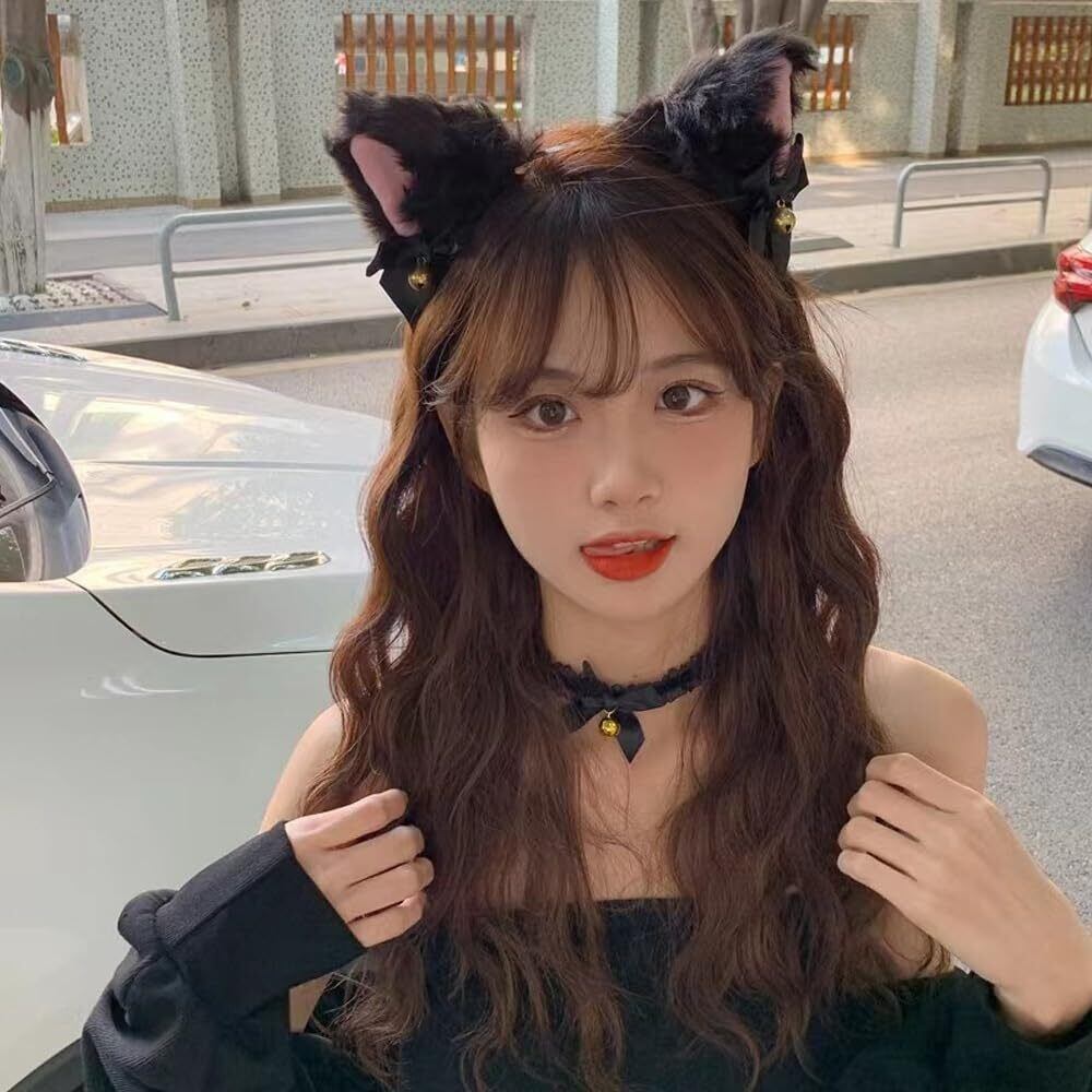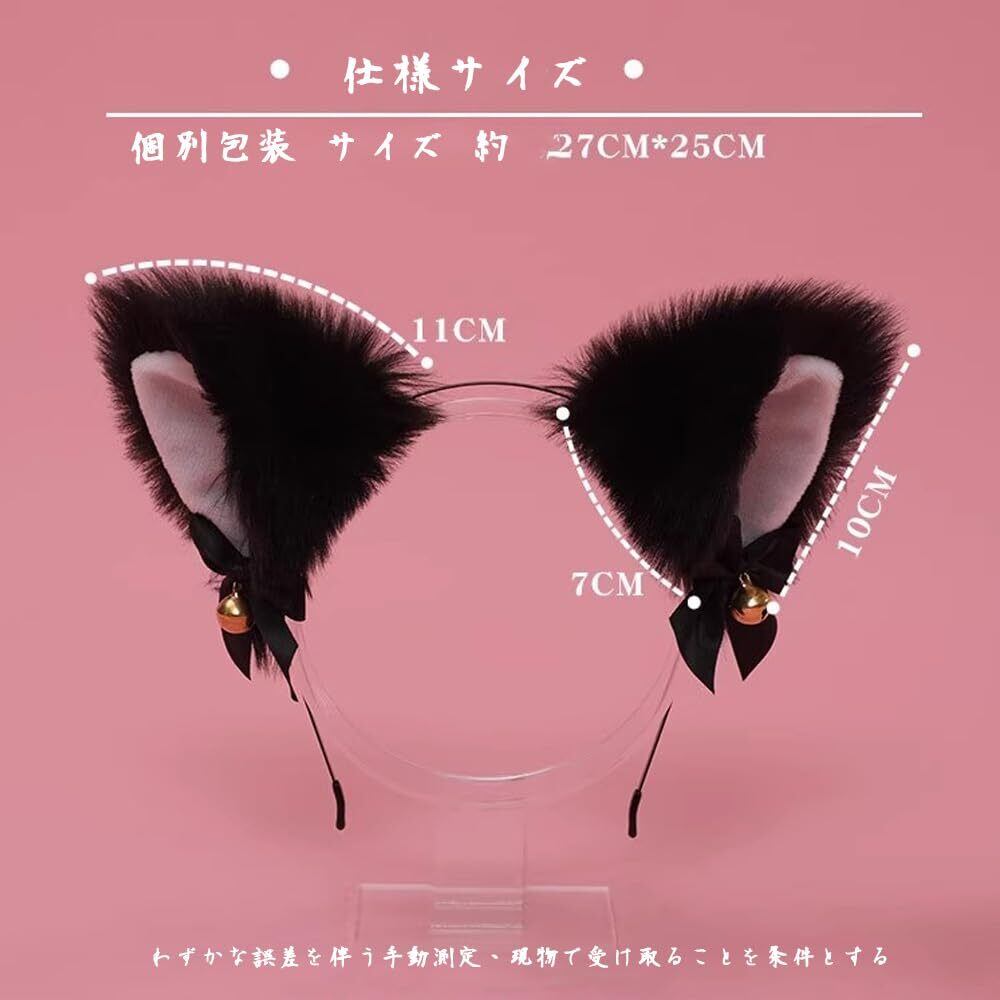 [ZUNNY HJERBOF] 猫耳 カチューシャ 2点セット 鈴付き リボン付き かわいい ねこ耳 ねこみみ 黒猫 ふわふわ コスプレ 仮装 小物 ヘアアクセサリー ヘッドバンド イベント 学園祭 ハロウィン