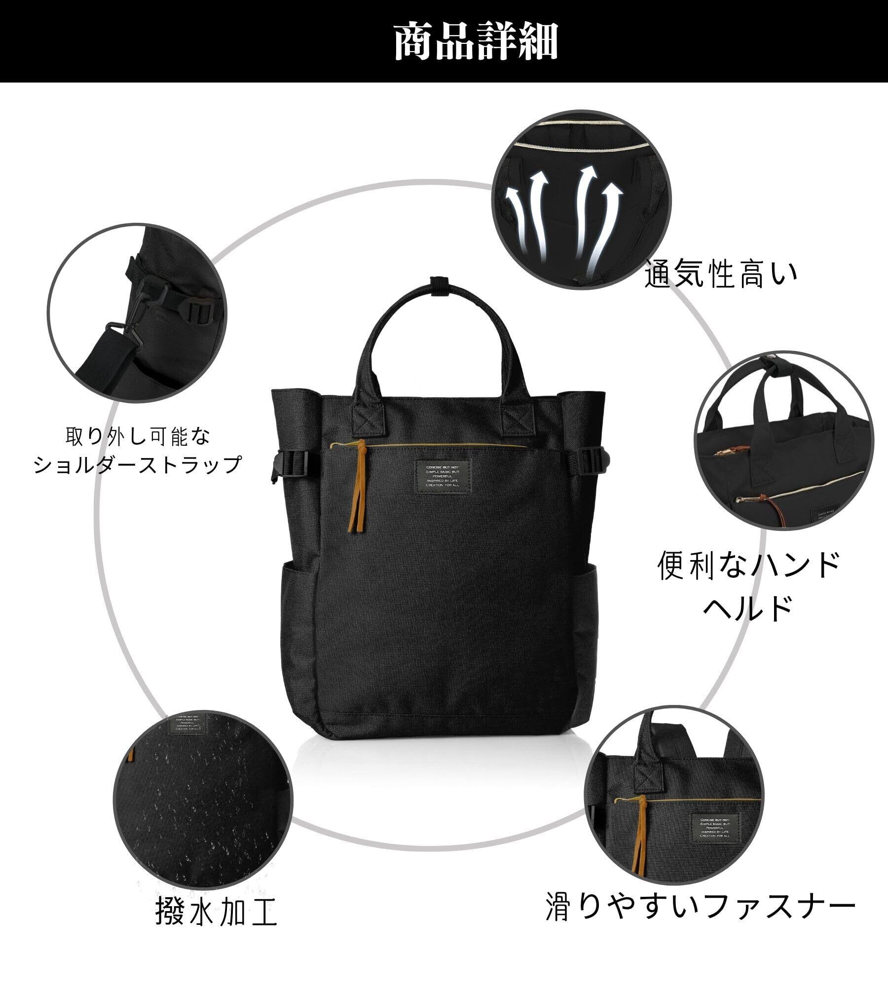 【デザイン】スタイリッシュでデザイン性の高いトートバッグです。トートの他、斜めがけでショルダーバッグ、手提げ袋、リュックスタイルにもなる4WAYタイプ多機能のカバンです。通勤通学、アウトドア、旅行に喜ぶ使える便利なバッグ。リュック用のベルトは収納可能で、不使用時もスタイリッシュです。ショルダーベルトも取り外し可能で,スタイルに合わせて変更できます