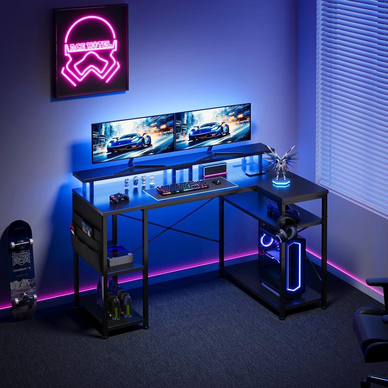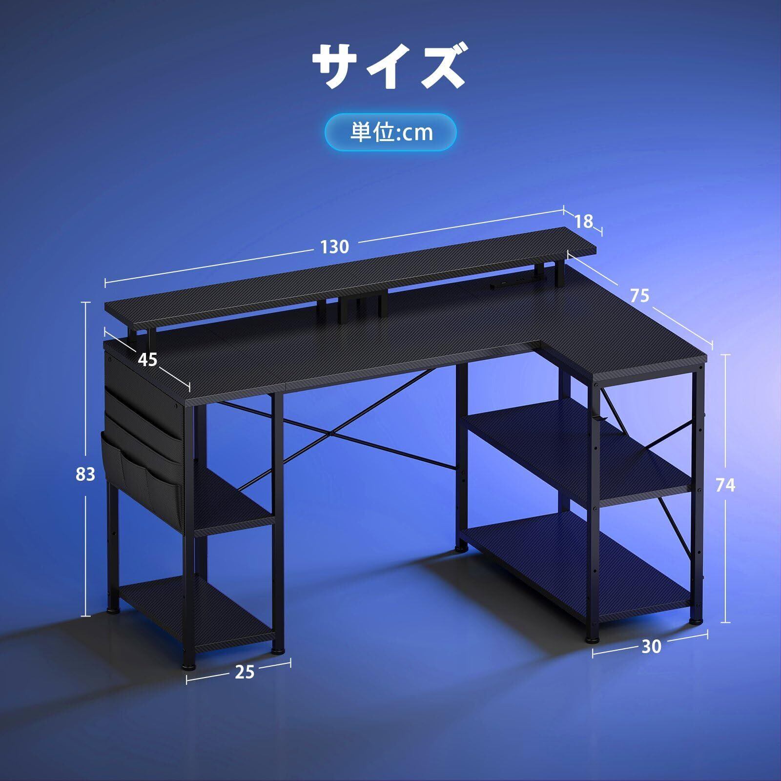 YeTom ゲーミングデスク幅130cm l字デスク LEDライト付き pcデスクコーナーデスク 棚板高さ調節可能 収納袋付き L字型 PC 勉強机 ゲーミングテーブル 左右入れ替え対応ゲーム 書斎黒い