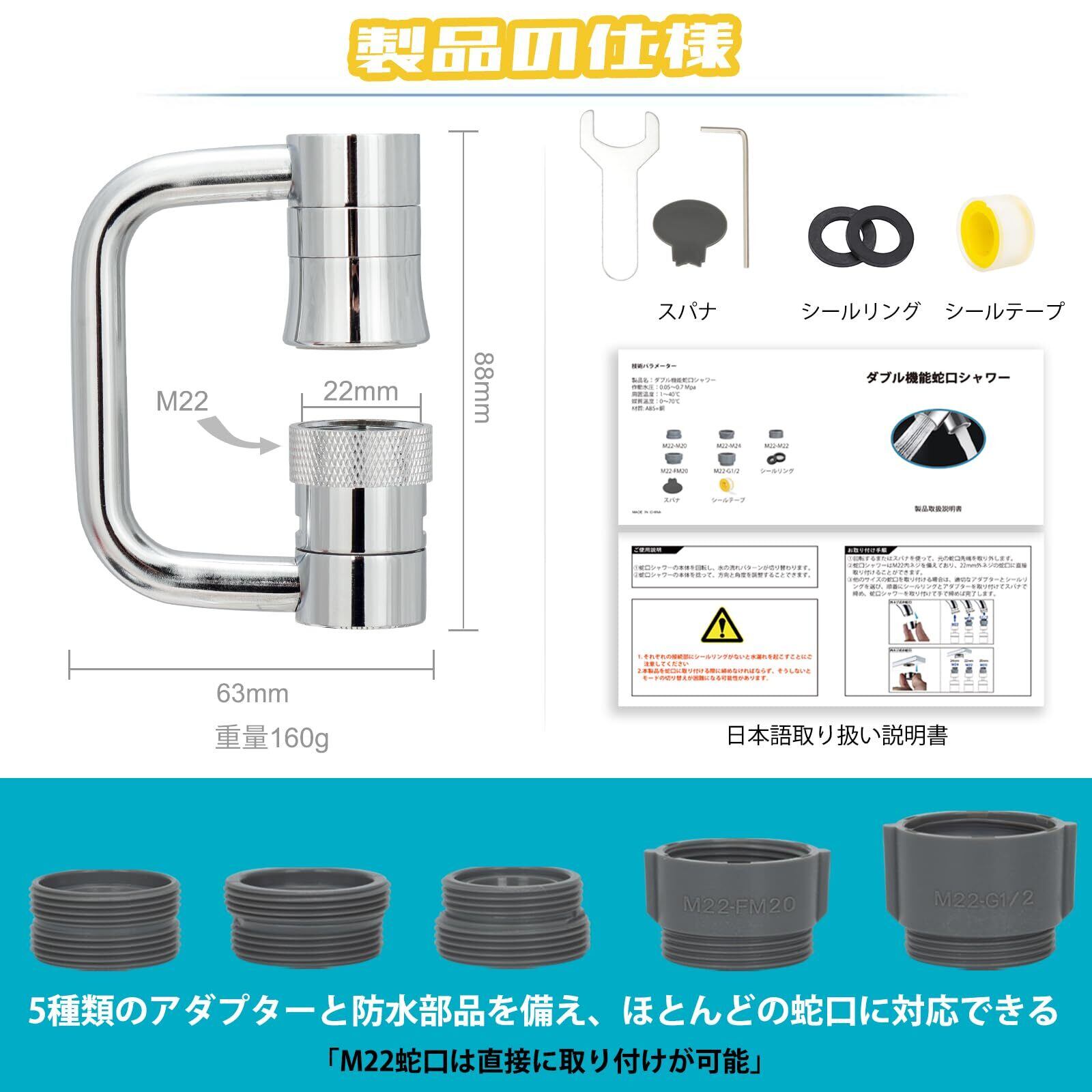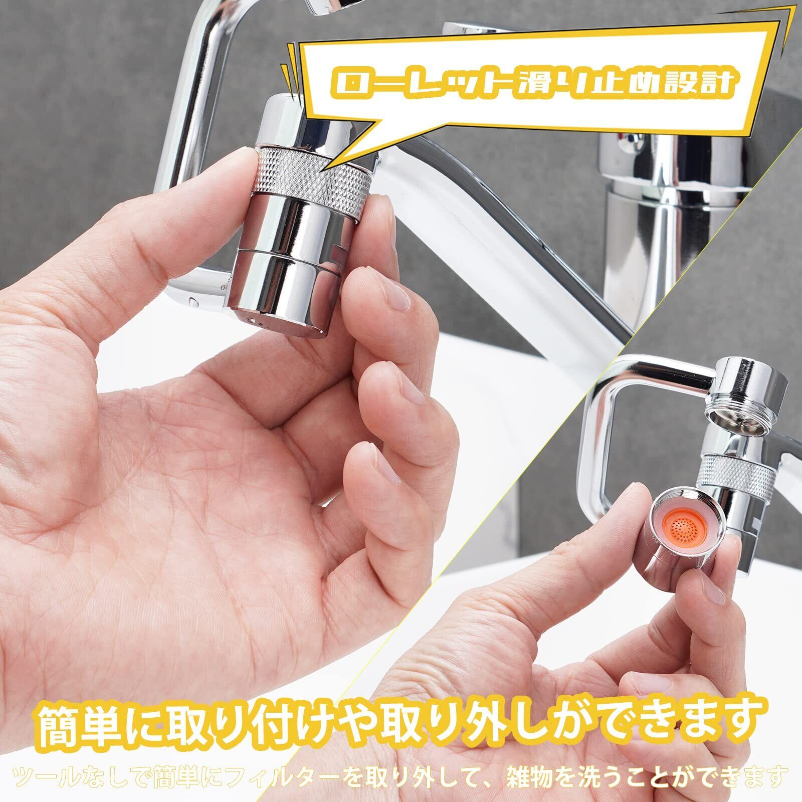 「取付けと取り外しが簡単」M22外ネジ蛇口は直接取り付けることができて、5種類のアダプータと防水部品を含まれます。ローレット滑り止め設計、ツールなしで簡単にフィルターを取り外してフィルター中の雑物を洗うことができます