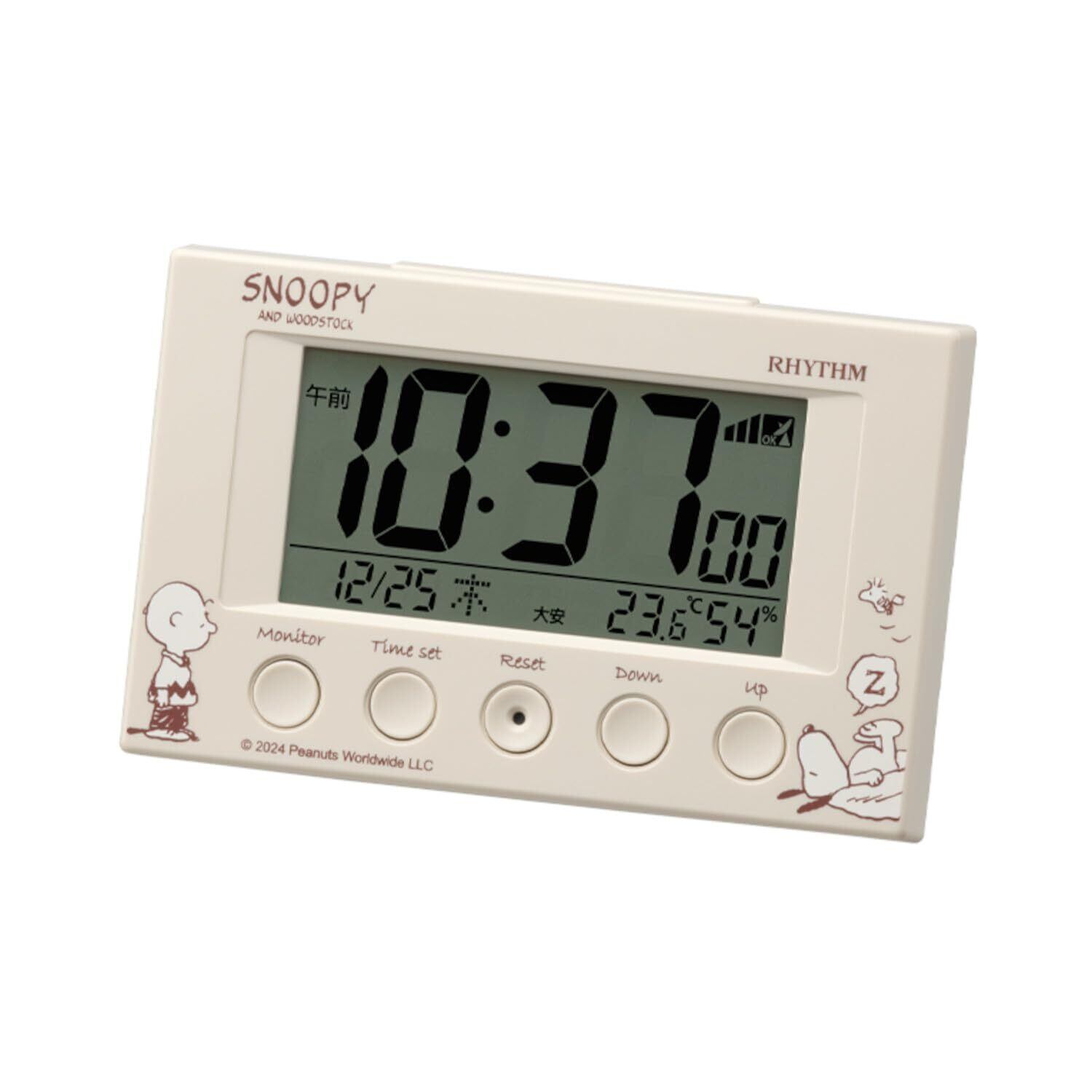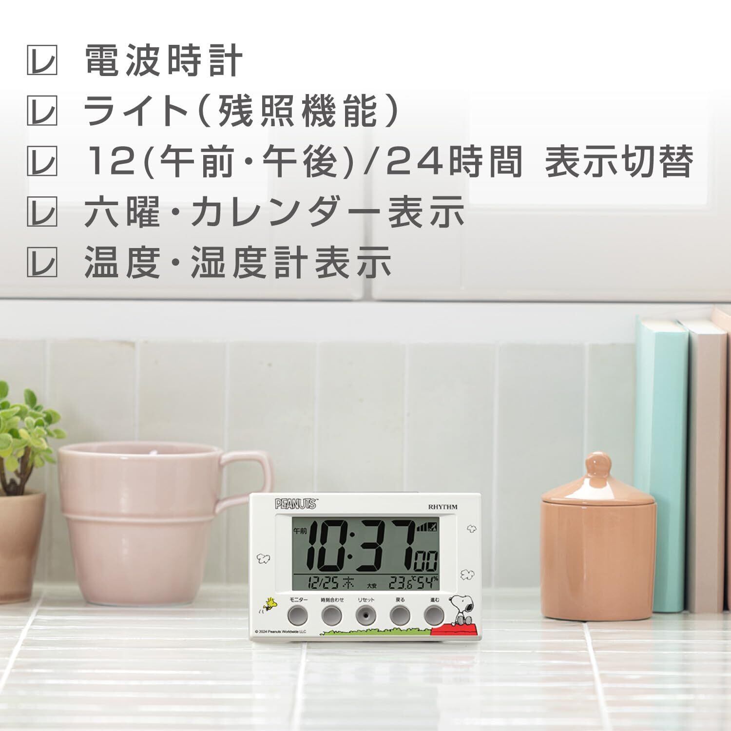 リズム(RHYTHM) スヌーピー 目覚まし時計 デジタル 電波時計 電子音 アラーム (スヌーズ 付) 温湿度計 カレンダー ライト ベージュ 7.7×12×5.4cm 8RZ166MS38