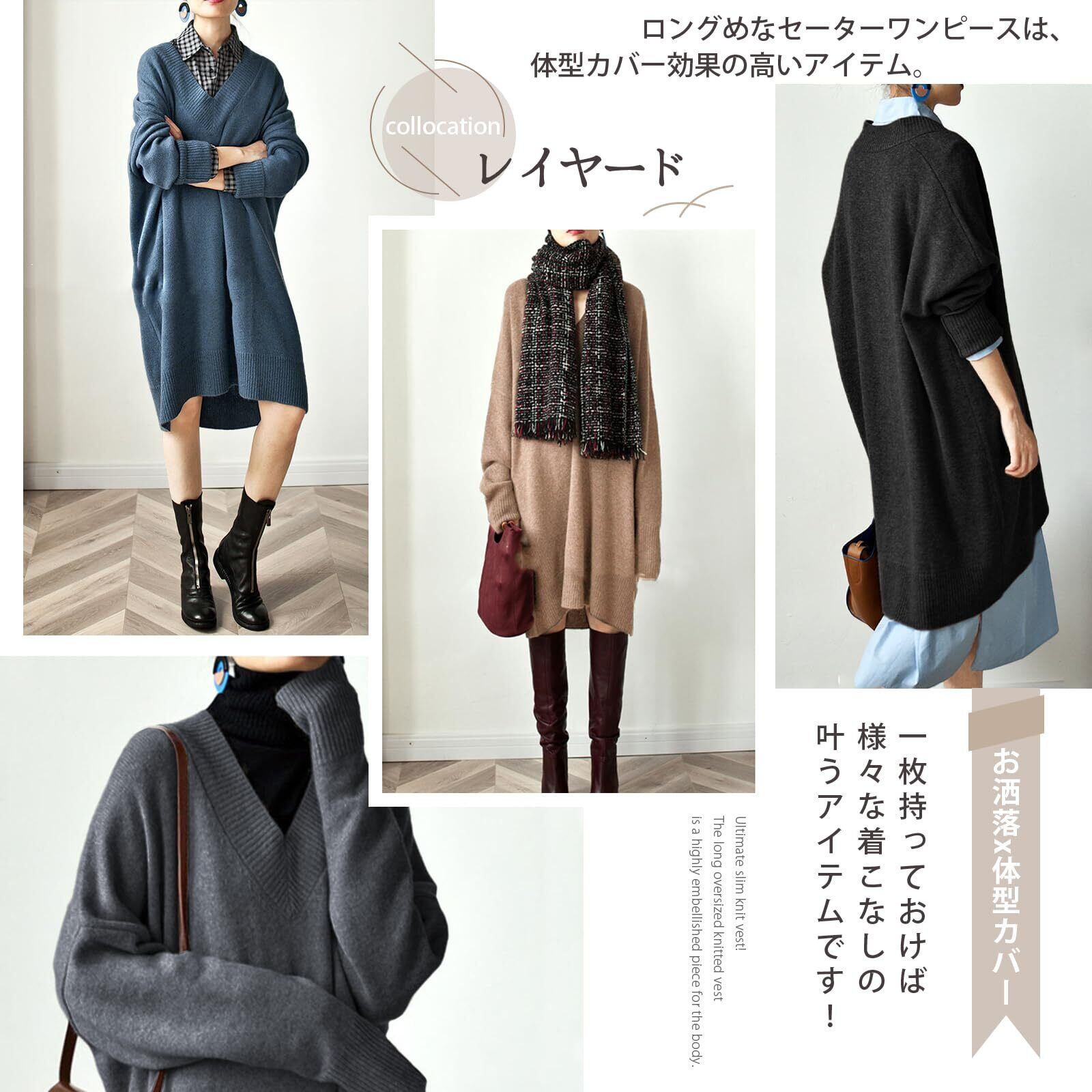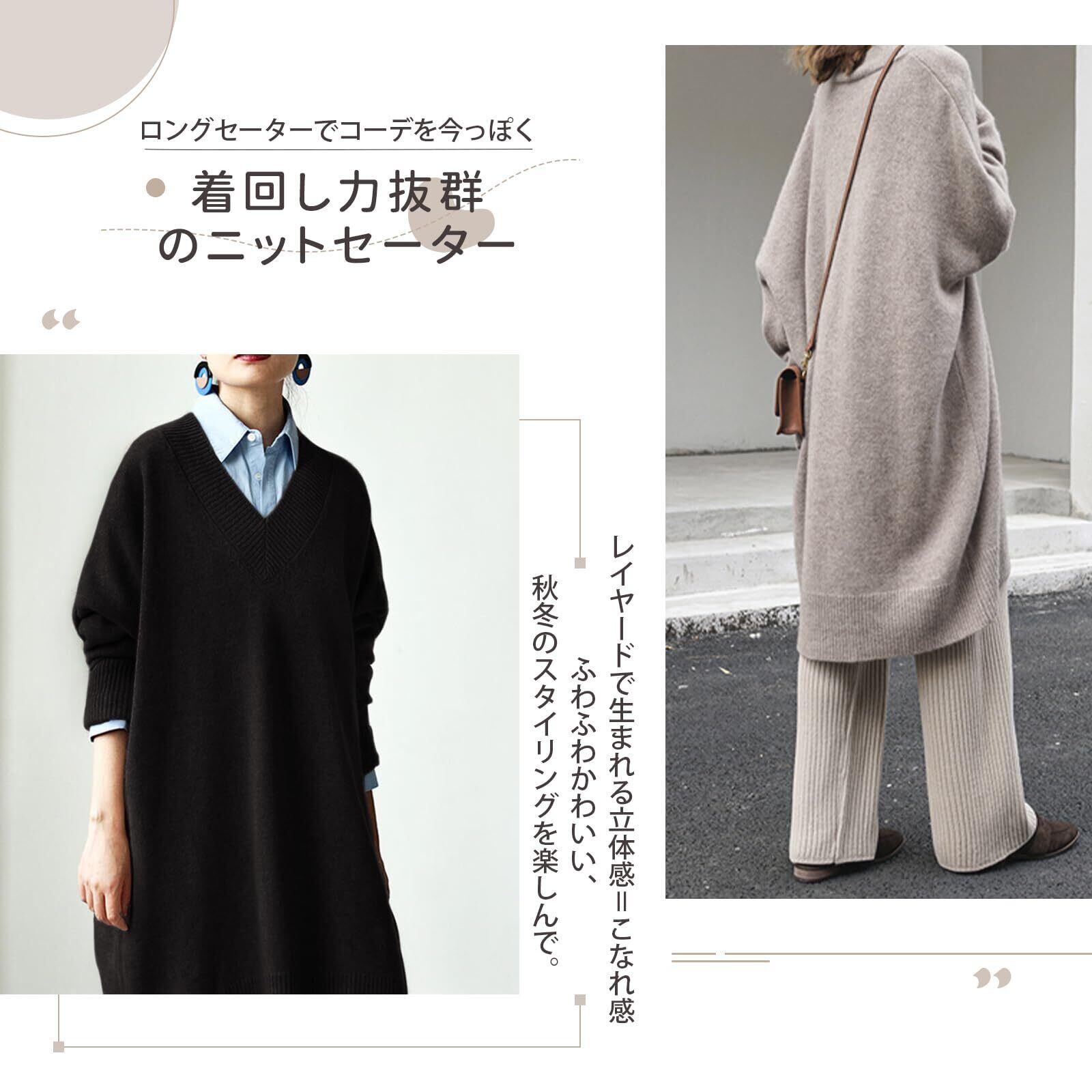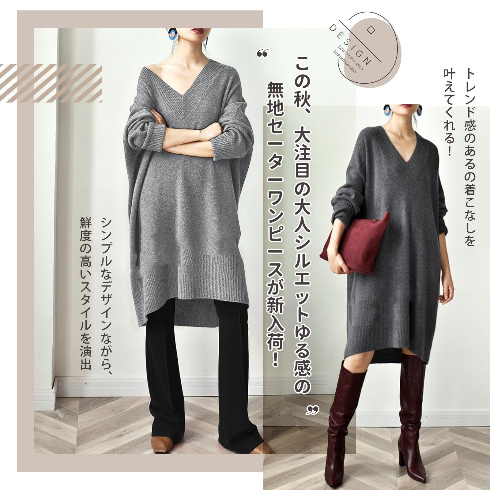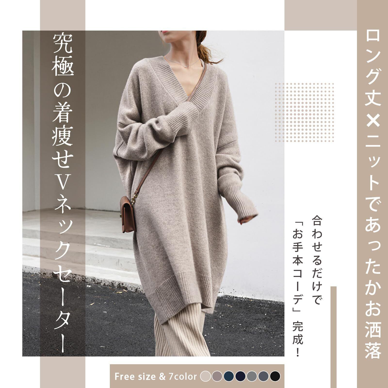 [Guooryvner] グオーリーブナー セーター ニット レディース vネック 秋 冬 セーターワンピース 長袖 チュニック トップス ゆったり ロング 膝丈 大きいサイズ オーバーサイズ ニットせーたー オフィス おしゃれ 厚手 着痩せ 通勤