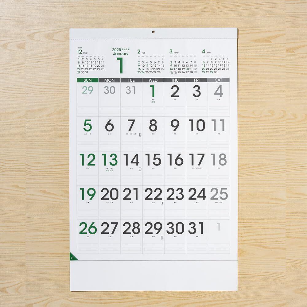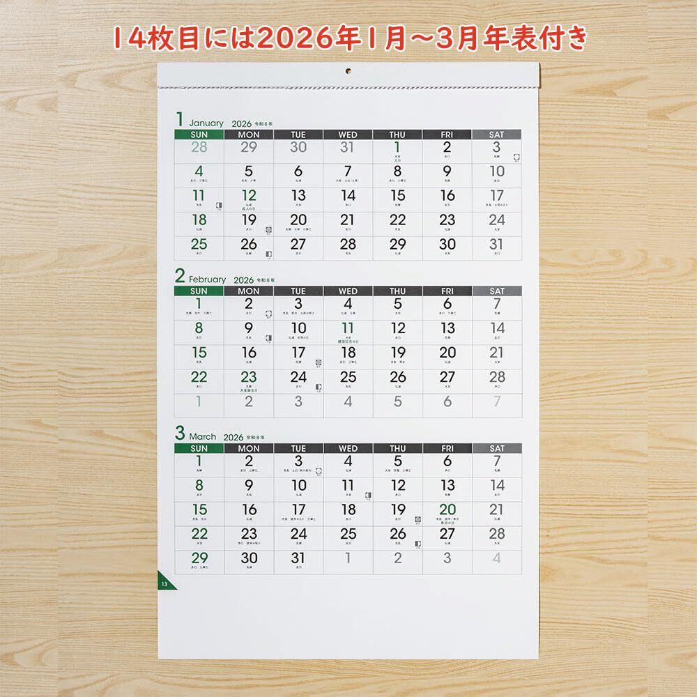 爽やかなグリーンを基調とした壁掛けカレンダー。 オフィスにもご自宅のリビングにも映えるデザインです。 左下にめくりやすいインデックス付き。 最終ページには2026年1月~3月のカレンダーがあり便利です。 実用新案登録 第3226838号