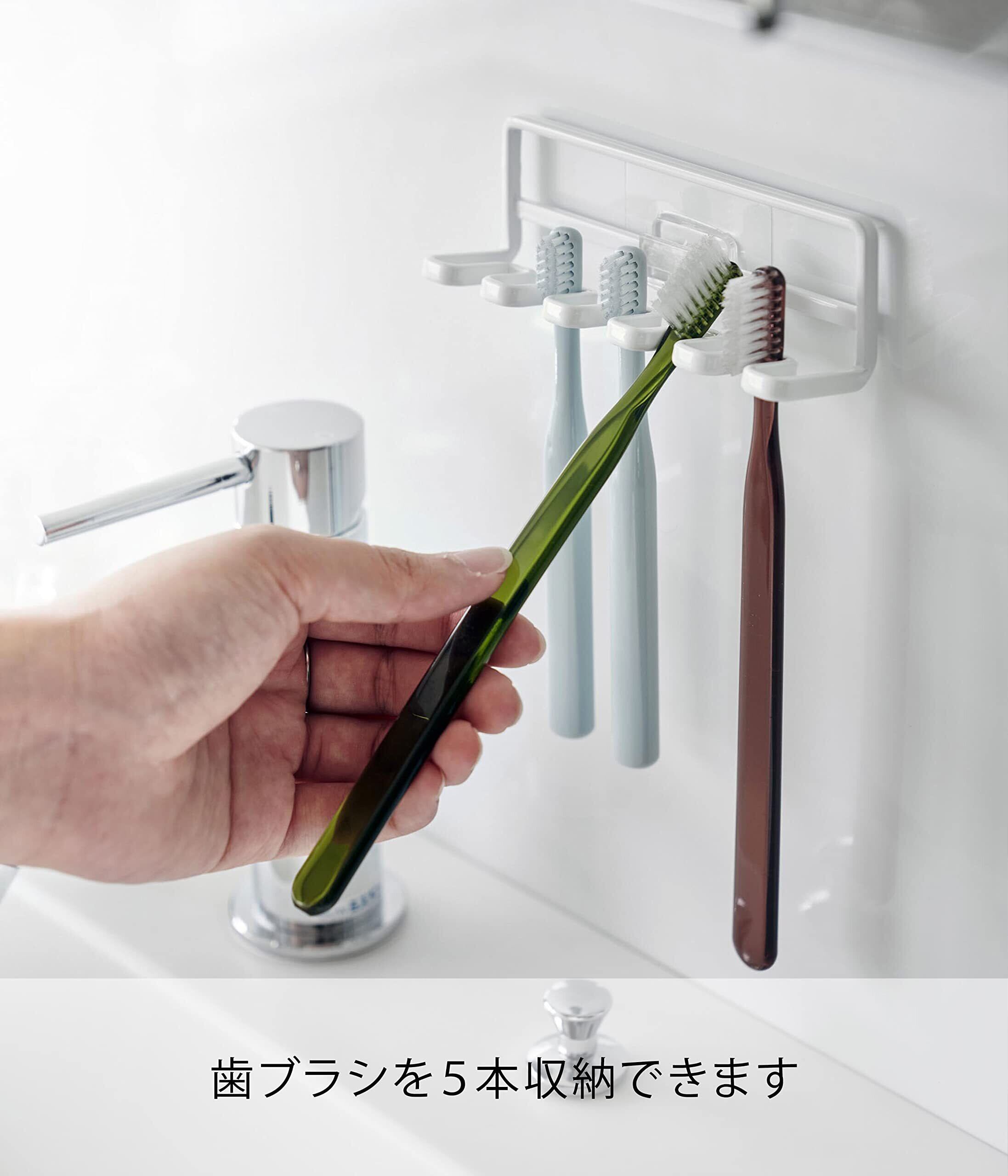 ●すっきりとした衛生的な収納を実現!●山崎実業のフィルムフック歯ブラシホルダーは、5連のデザインで最大5本の歯ブラシをすっきりと収納できます。電動歯ブラシにも対応しており、忙しい朝でも手軽に使えるアイテムです。