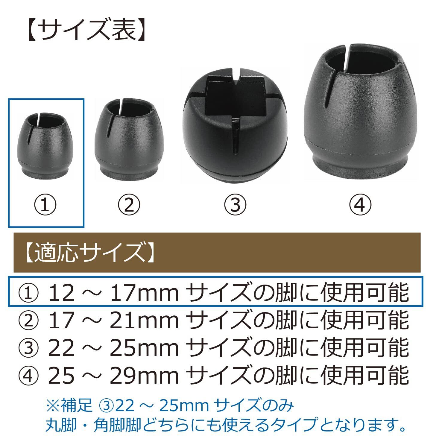 【①サイズ】外径12mm~17mmの脚に取り付け可能。全16個入り (4脚分)