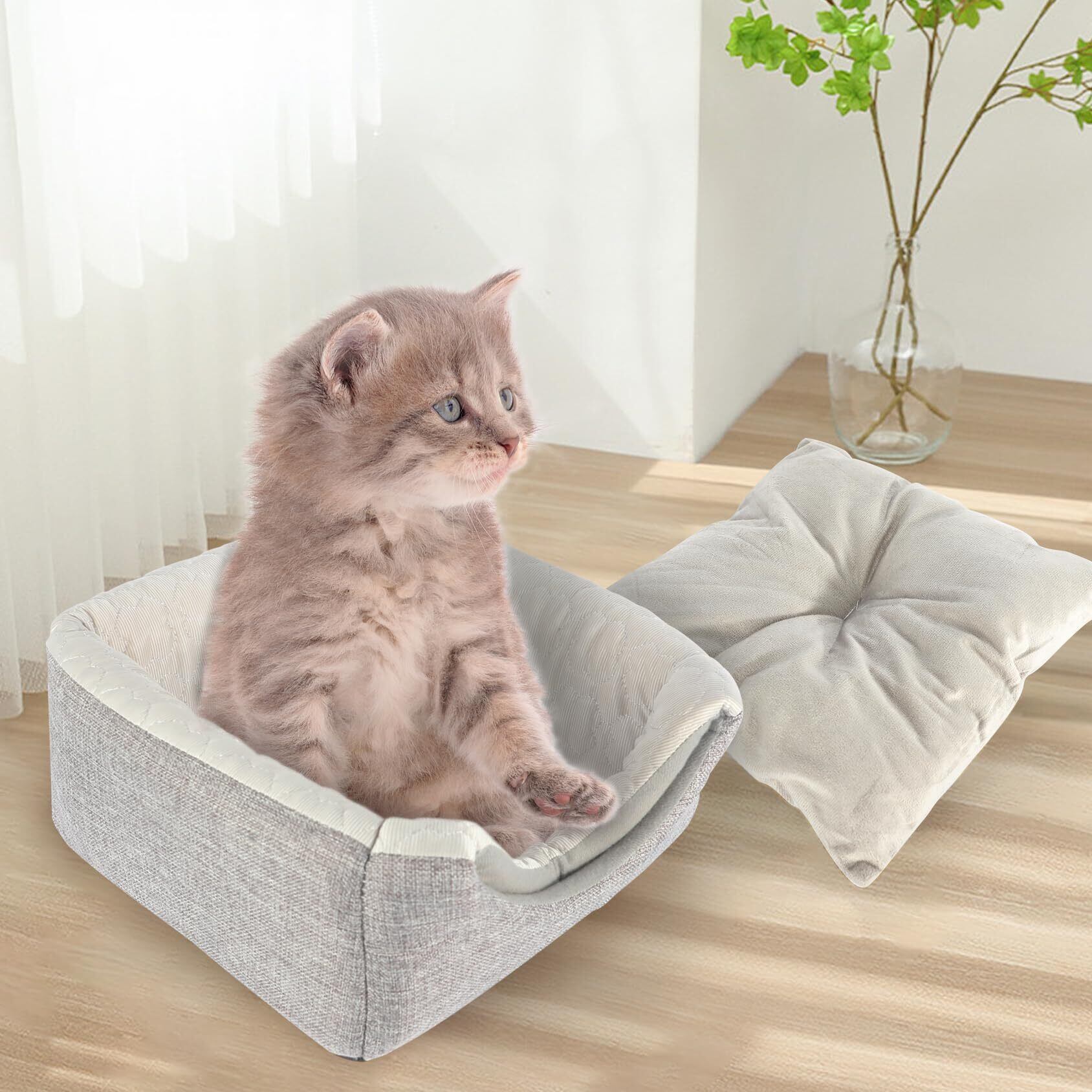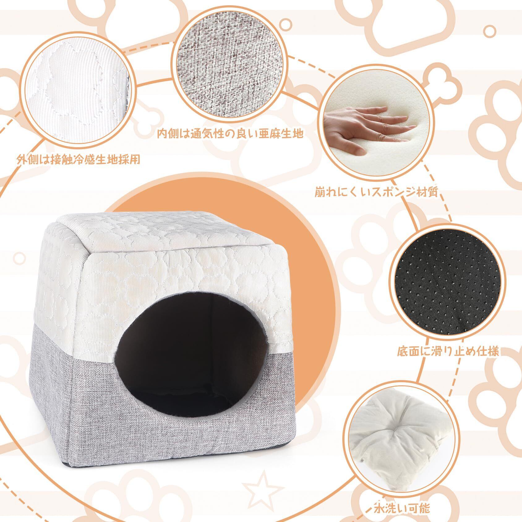 【商品仕様】Mサイズ(展開):約35*30*33CM、入り口の直径:約22CM。色:グレー 重さ:約0.58kg 材質:接触冷感生地・亜麻生地・スポンジ材質 セット内容:ペットハウスx1クッションx1(真空圧縮パッケージ)備考:水洗い可能 小型犬や猫に適用、他の小型ペットにもお使いいただけます。