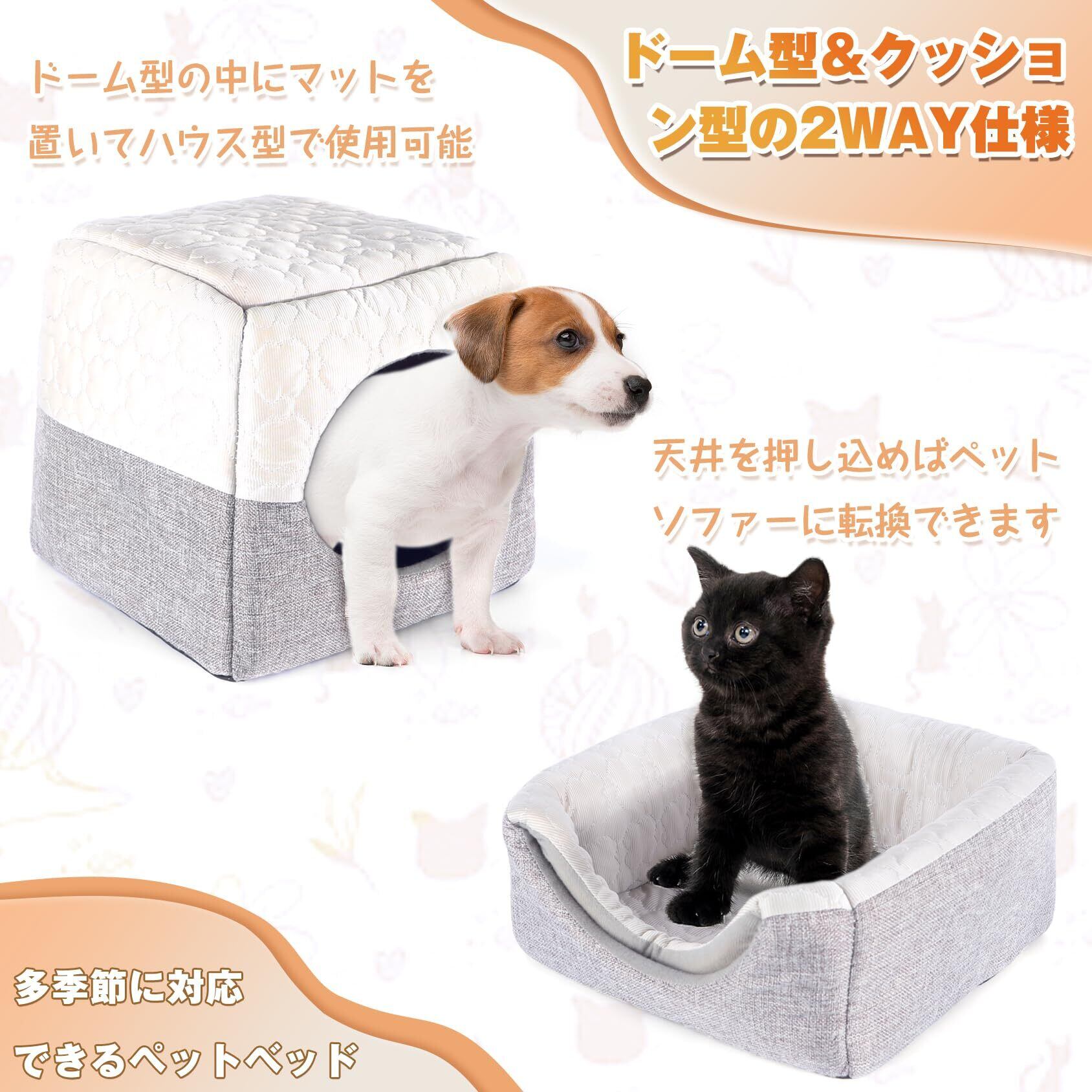 【3WAYベット型/ハウス型/ソファー型】自由に変換できる3WAY仕様、使う場合と季節によってお気楽に転換できます。ハウス型にして狭くて暗い場所が好きなネコちゃんに適用、ハウスの天井を押し込めば、ペットベッドとしても使用することができます。天井の2つの角を押し込めば、ペットソファーにも転換できます。大切な猫ちゃんやワンチャンが快適な空間の中で休めます。
