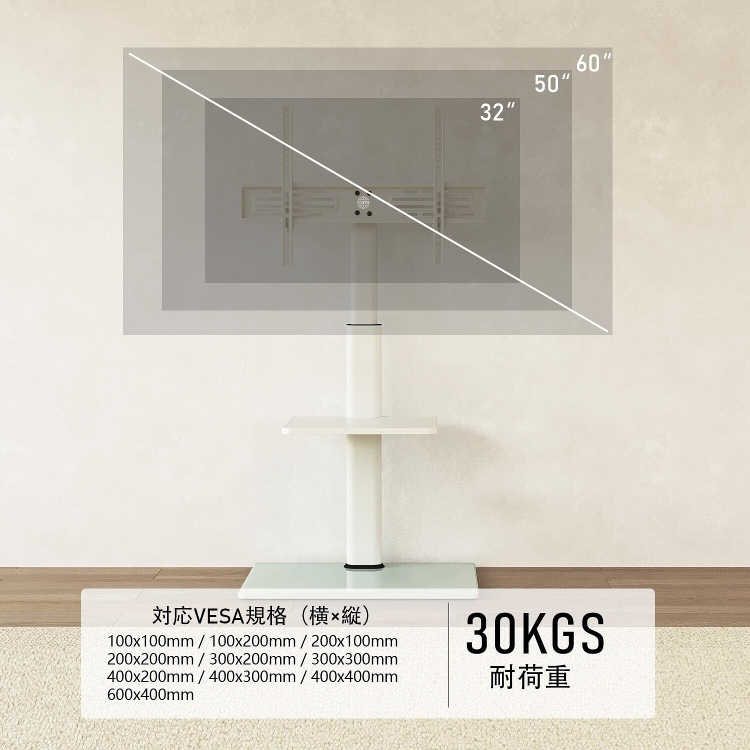 【VESA規格対応】汎用性の高いVESA規格(テレビ背面のネジ穴間の距離)対応、最小限は10×10cm、最大限は60×40cmです。当製品が32~60インチのテレビやモニターに適応します。