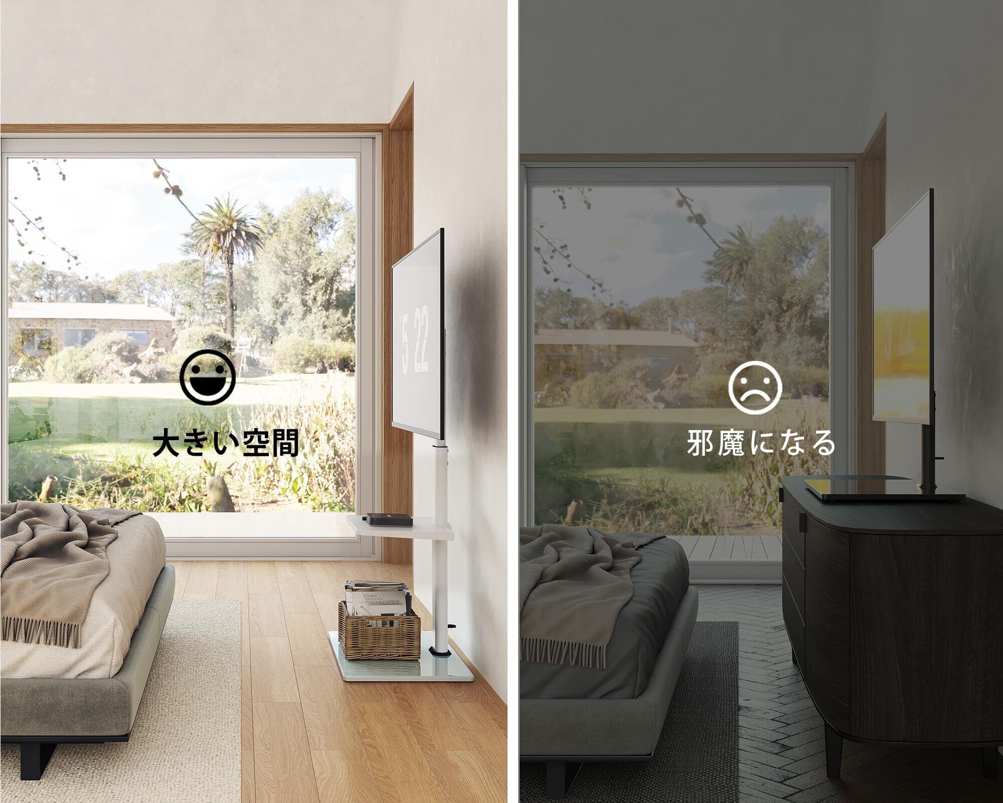 【配線を隠す】支柱のデザインにより、テレビスタンドの後ろにケーブル管理機能がありますので、配線はスタンドの後ろにきれいに収納でき、お部屋がスッキリとなります。底に滑り止めのゴムパッドが付いて、安定性が高いです。