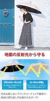 地面の反射光から守る 光を反射しないブラックコーティング裏地で、 地面の照り返しや反射からもガード! コーティングなし:傘がパラボラアンテナの様になり、反射光が顔付近に集中します。 ブラックコーティング:黒い裏地が光を吸収するので、反射しません。