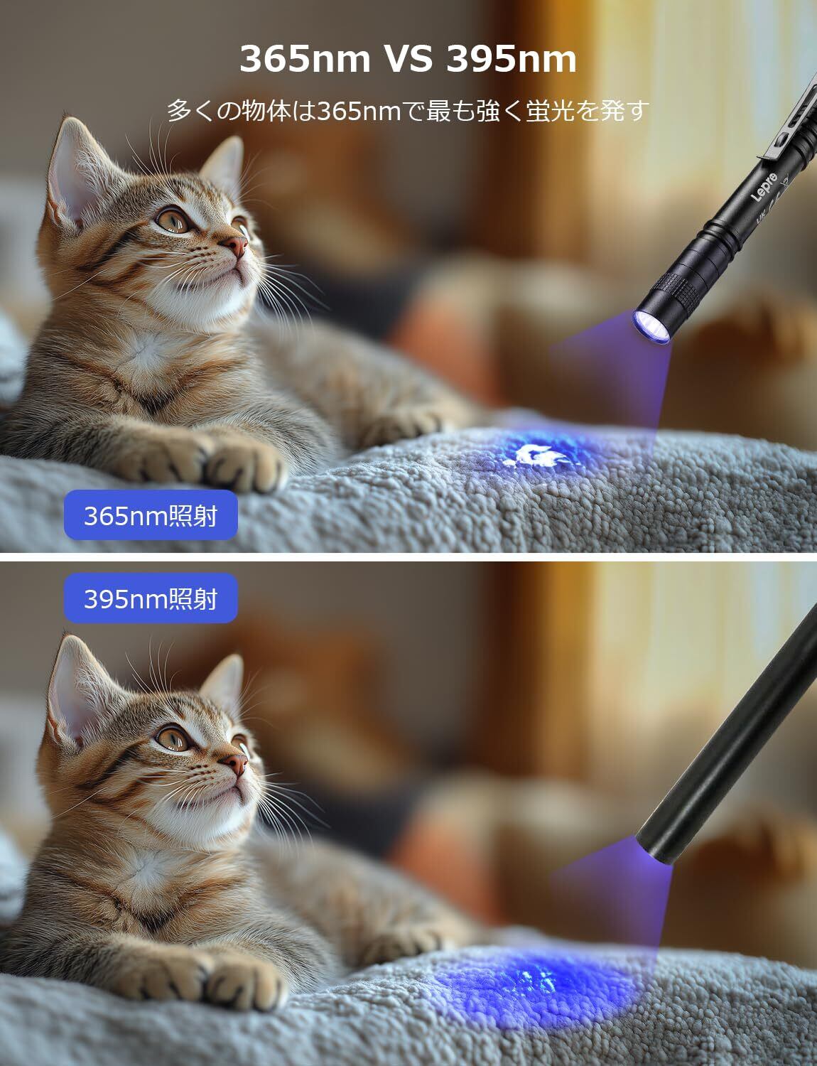 【強力な蛍光を求めるなら、365nmが最適】Lepro UVライトは、性能を重視するシーンに最適な高性能365nm波長のUV-LEDを搭載しています。365nmの紫外線は、一般的な395nm波長と比べて可視光や紫色光の放出が少ないです。この特性により、多くの物体がより強く鮮明な蛍光を発します。純粋で鮮明なUV効果を実現できるため、強力な蛍光が求められる場面で真価を発揮します。