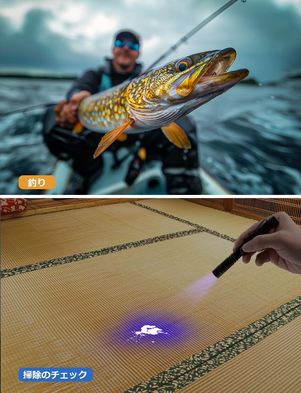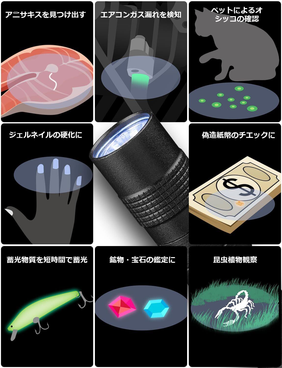【多用途に活用可能】紫外線ライトとして、部屋の掃除、夜間の釣り用照明、鉱物や宝石の確認、偽造印刷物の検査、紙幣の偽札判定、サソリなどの探索、化粧品や日用品の蛍光検出、衣類に残留した蛍光剤の検出、機械のオイル漏れ点検など、さまざまな用途に対応可能です。