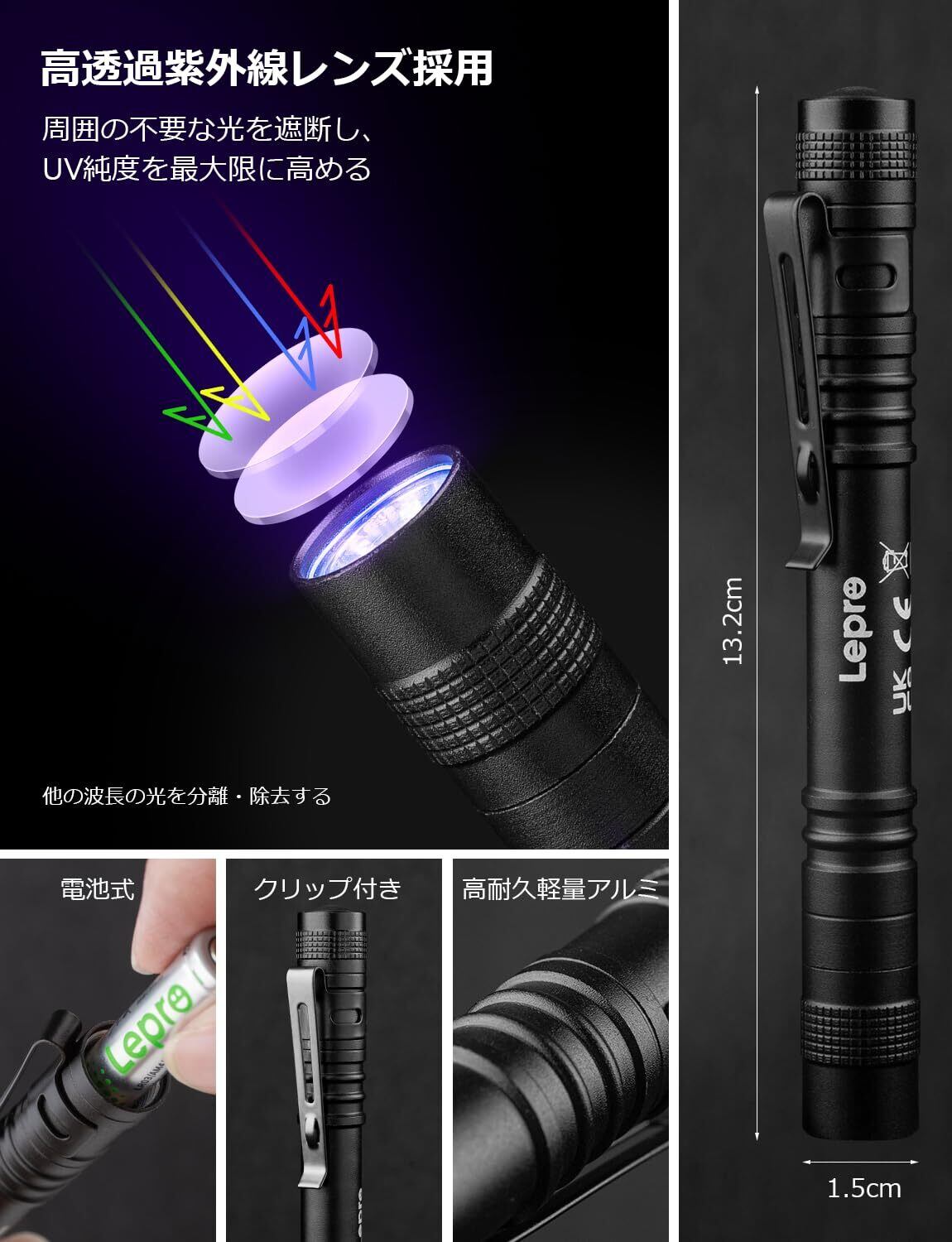特徴 365nm高性能, クリップ付き, 小型軽量, 高耐久性アルミ