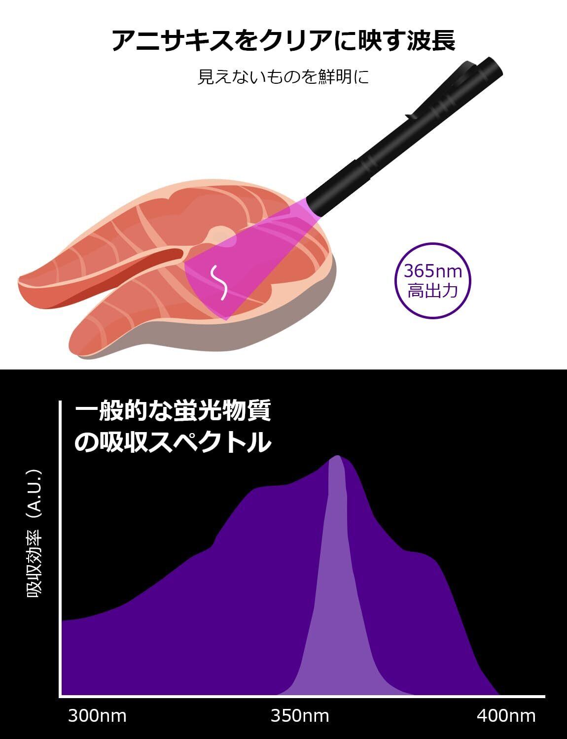 【アニサキス対策!魚を気軽に食べる】生鮮魚介類を調理する前に、波長365nmの紫外線ライトで照射することで、肉眼では見えにくいアニサキスを発見できます。Lepro 365nm UVライトは、釣りを楽しむ方へのプレゼントにもおすすめです。