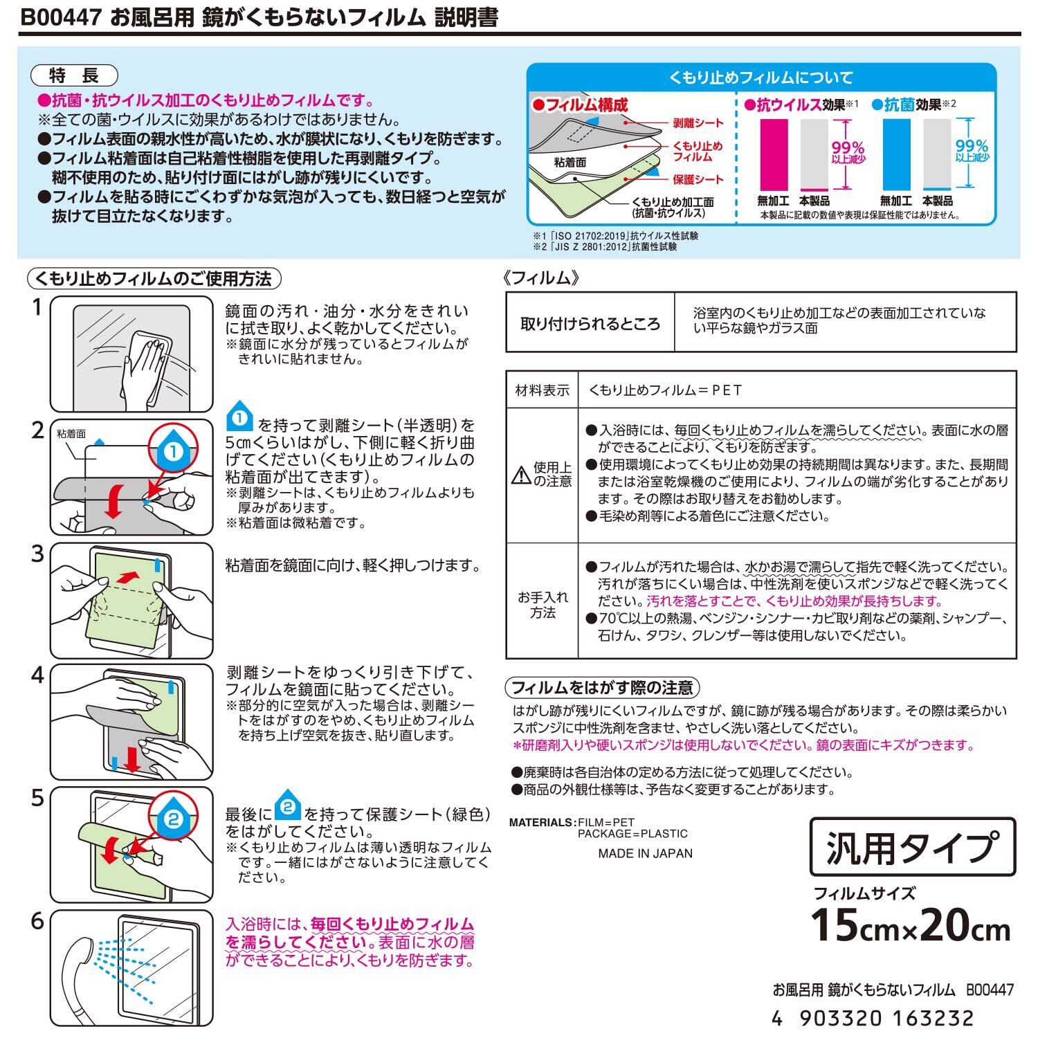鏡がくもらない抗菌・抗ウイルス加工くもり止めフィルム!
