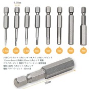 【商品仕様】セット内全長さ:50mm、軸径:6.35mm六角軸(1/4インチ)。六角ビット8個セット:H1.5(1.5mm)、H2(2mm)、H2.5(2.5mm)、H3(3mm)、H4(4mm)、H5(5mm)、H6(6mm)、H8(8mm)。