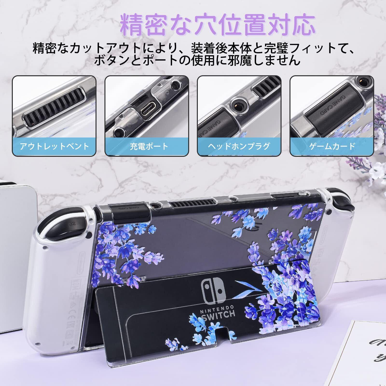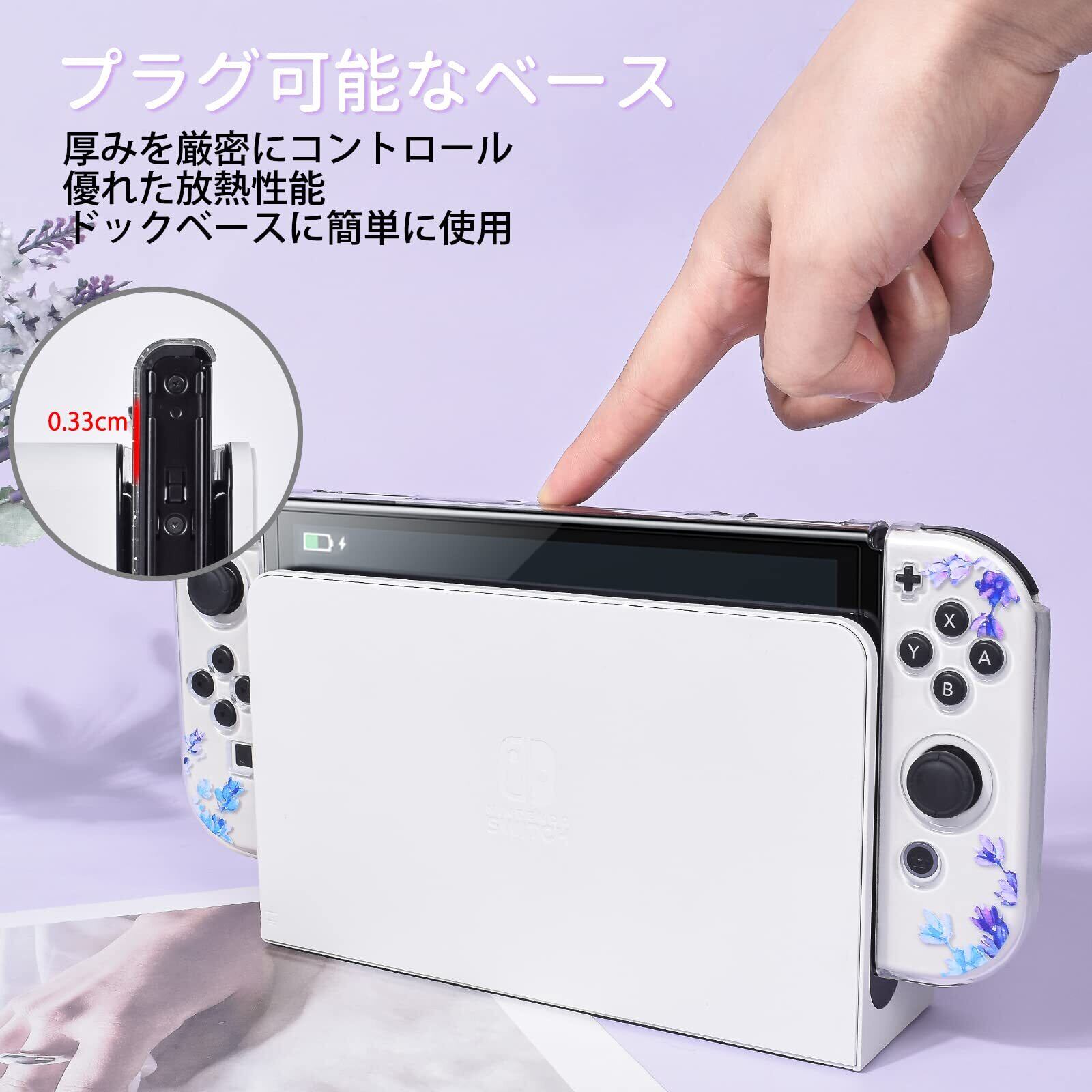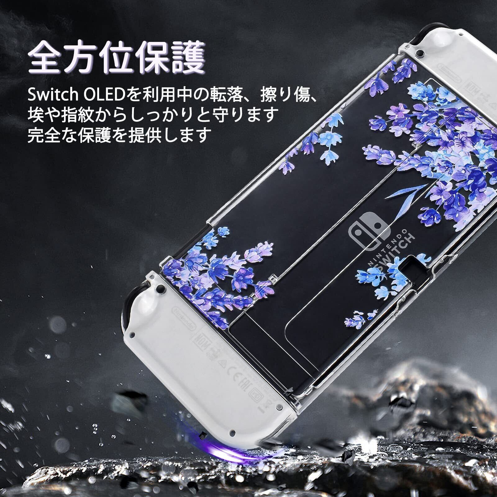 【実用設計▪ファッション】超薄分離式デザインでSwitch OLEDにフィット合っていて、安定性が抜群です。着脱が非常に簡単で、取り付けと取り外しを繰り返しても本体にキズ付きにくいです。スタイリッシュな花柄のラベンダー柄が、人目を引く、とても美しいものにします。