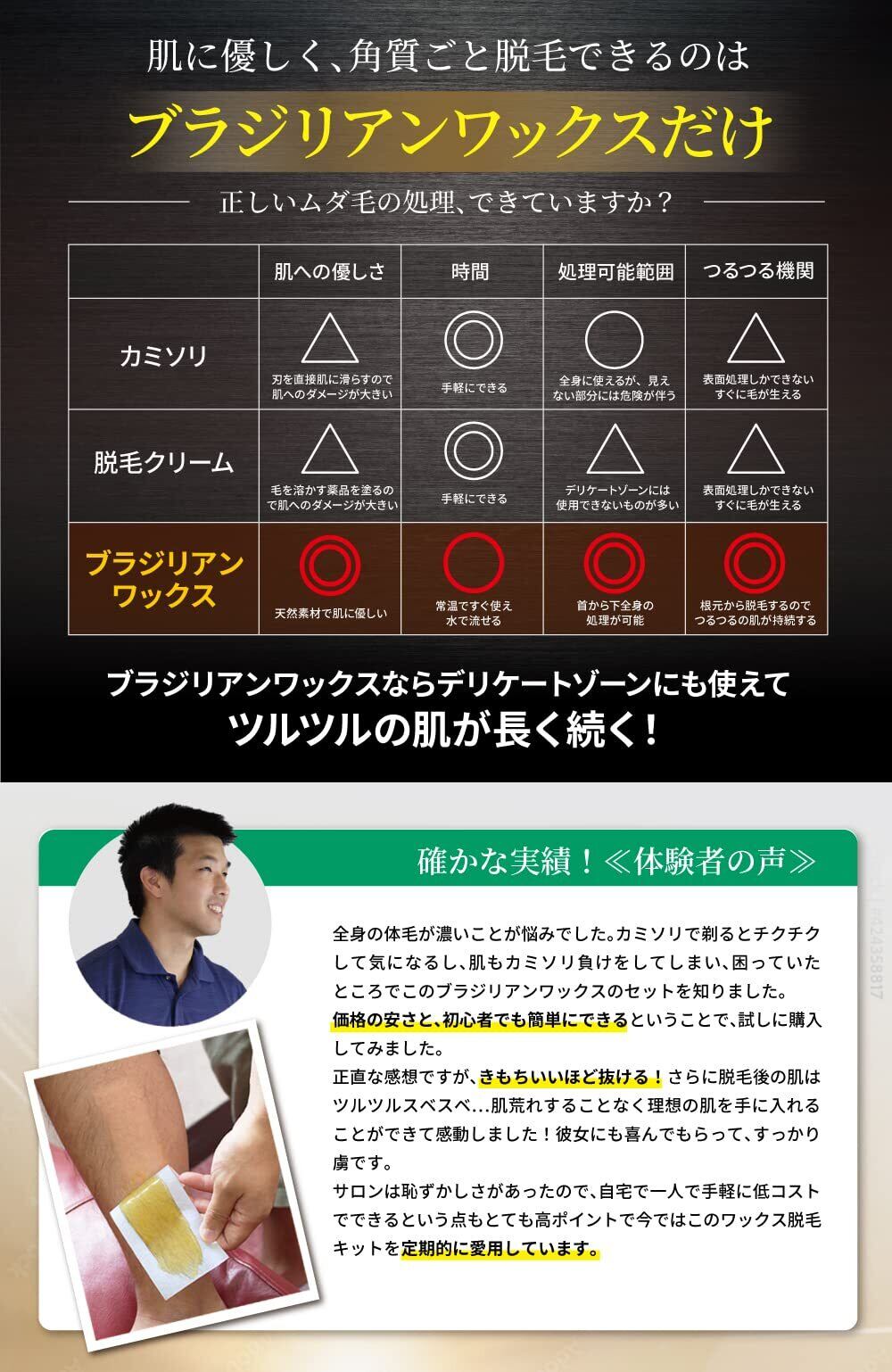 【使用用途】デリケートゾーンを含めた首から下の全身にお使いいただけます。お顔へのご使用はご遠慮ください。【ご注意】ご使用の際は必ず説明書をお読みください。当製品はソフトワックスになります。固まらず、付属のペーパーを貼り付け剥がすことで待ち時間無しで、手早い処理が可能です。固まるブラジリアンワックスをお求めの際はハードワックスをお探しください。