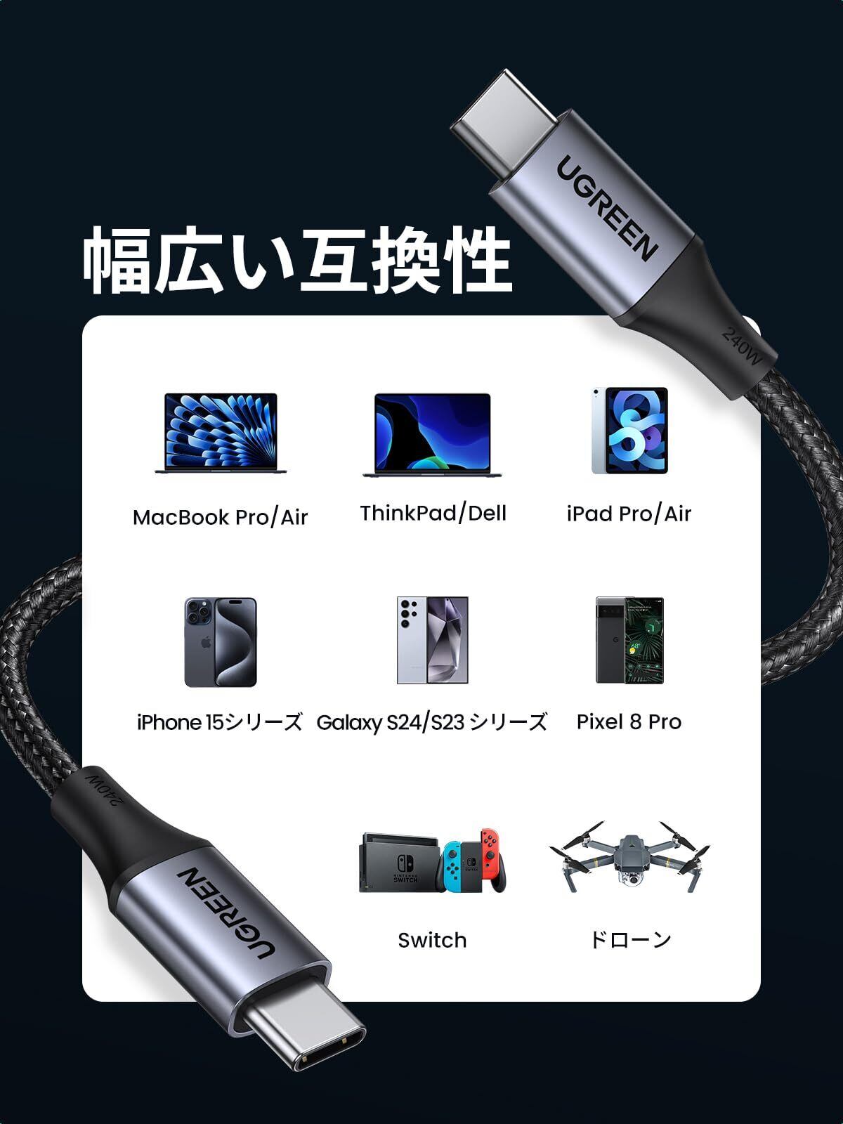 UGREEN PD3.1 240W USB Cケーブル超急速充電 USB Type C ケーブル 高耐久ナイロン iphone17/16/15シリーズ 、MacBook Pro、iPad mini、Matebook、iPad Pro、Xperia、Galaxy等Type C機種対応 (1m)