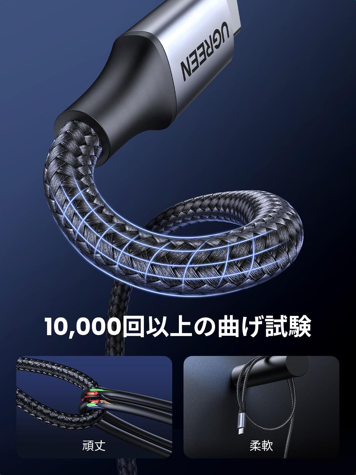 【耐久性と柔軟性を両立】UGREEN 5 A USB Cケーブルは、コンパクトで信頼できるアルミニウム合金シェルとナイロン編まれたケーブルを使っている優れた高品質製品を提供します。ナイロンファイバー被覆構造で15000回以上の折り曲げ試験に合格し、一般的なUSBケーブルより寿命を4倍以上に向上する高耐久Type C ケーブルです。