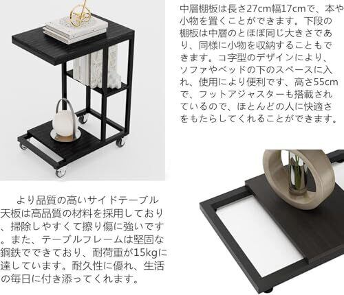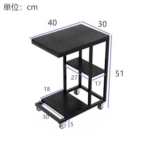 ZXD サイドテーブル ワゴン キャスター付きコの字型デザイン ベッド リビングサイドテーブル ソファ ブラックエンボス