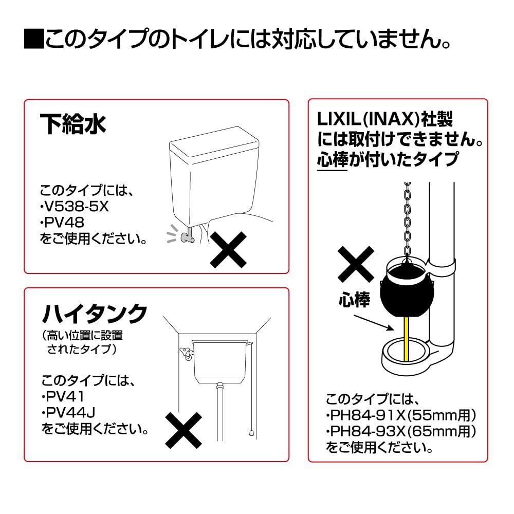 一般に使用されている、ほとんどのタイプに対応しています。(下給水,ハイタンクのトイレには対応していません。) ボールタップ:下給水,ハイタンクのトイレには対応していません。ゴムフロート:LIXIL(INAX)製には対応していません。