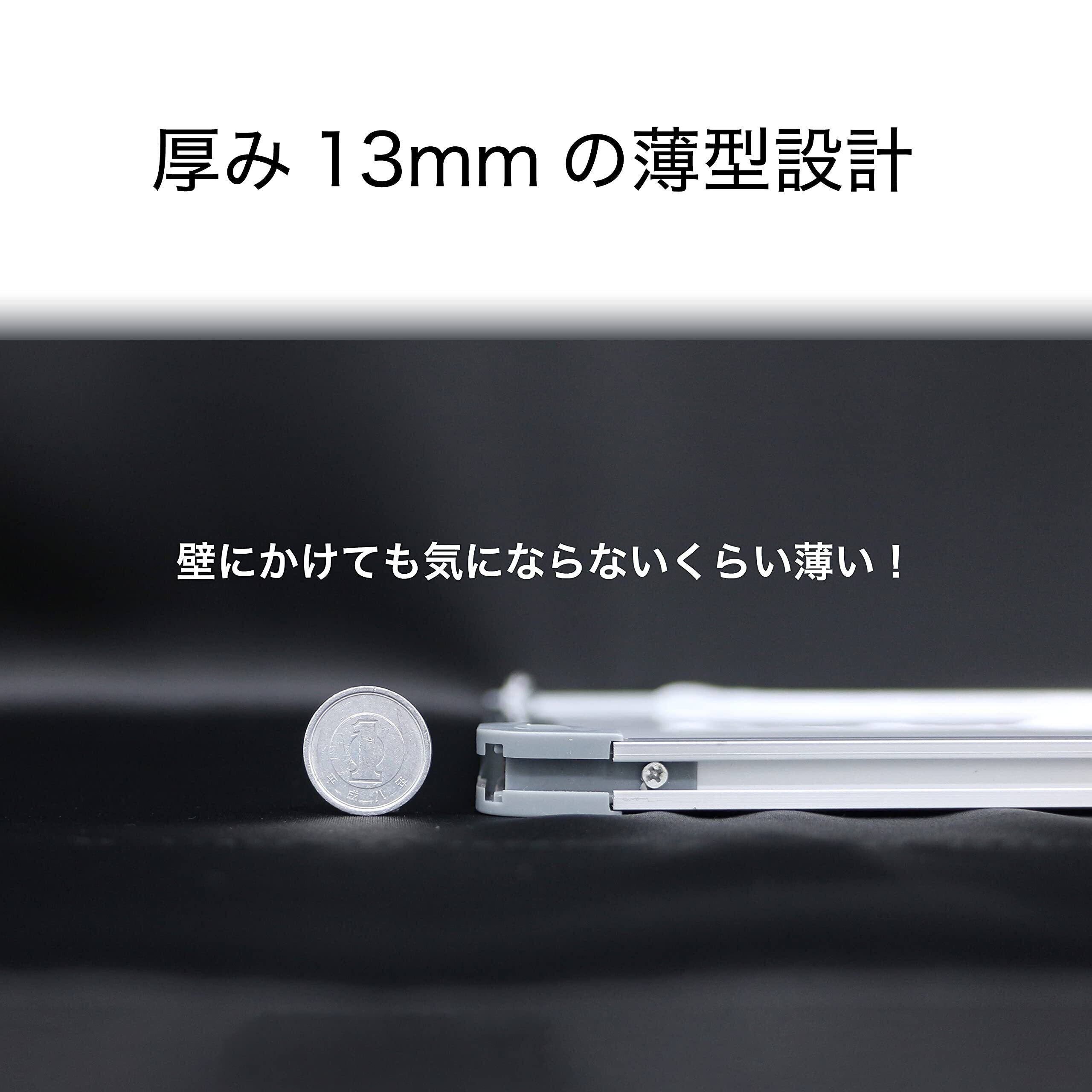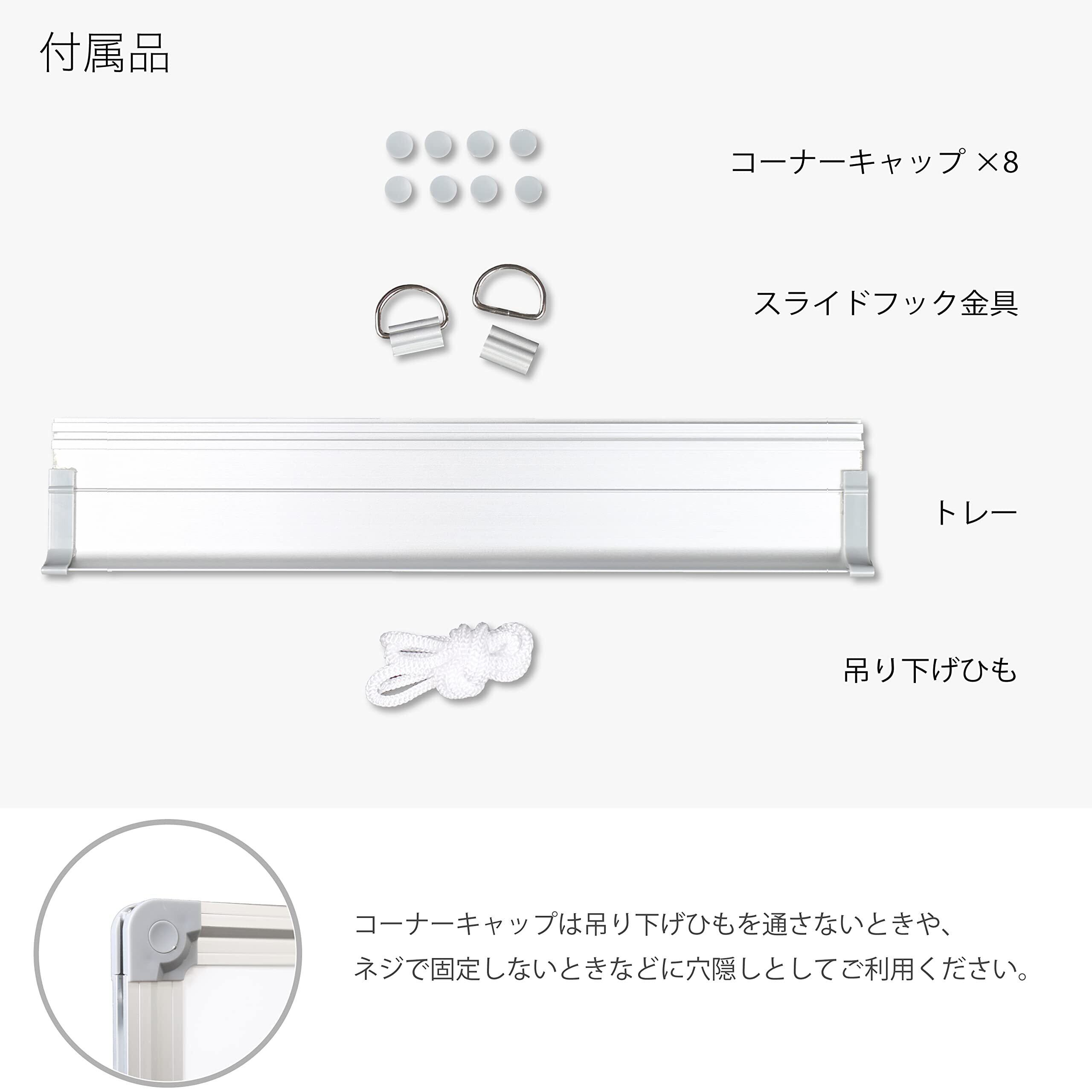 ●フレーム厚さ11mmの薄型ホワイトボード(コーナー部は厚み13mm)。タテヨコ両用●アルミ枠でしっかり丈夫な上、裏面が鉄板だから反りにくい●トレーはスライド式。書き込むときに、動かしたり外したりできます●4隅に穴が開いておりネジ留めやヒモ留め可、スライドフック金具も付属