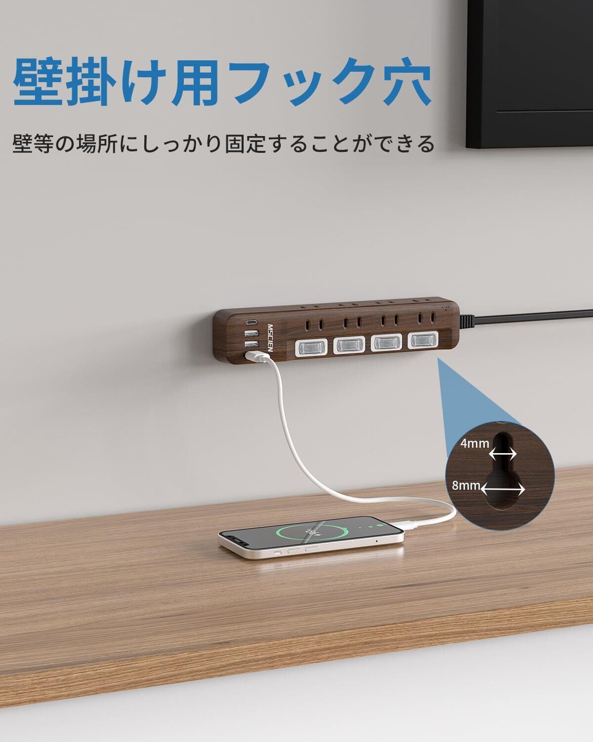 [Mscien] 延長コード 2m 電源タップ USB付き コンセント 雷ガード USB-C マルチ スイッチ たこあし分岐 OAタップ テーブルタップ スイングプラグ 壁掛け 木目調 ウォルナット