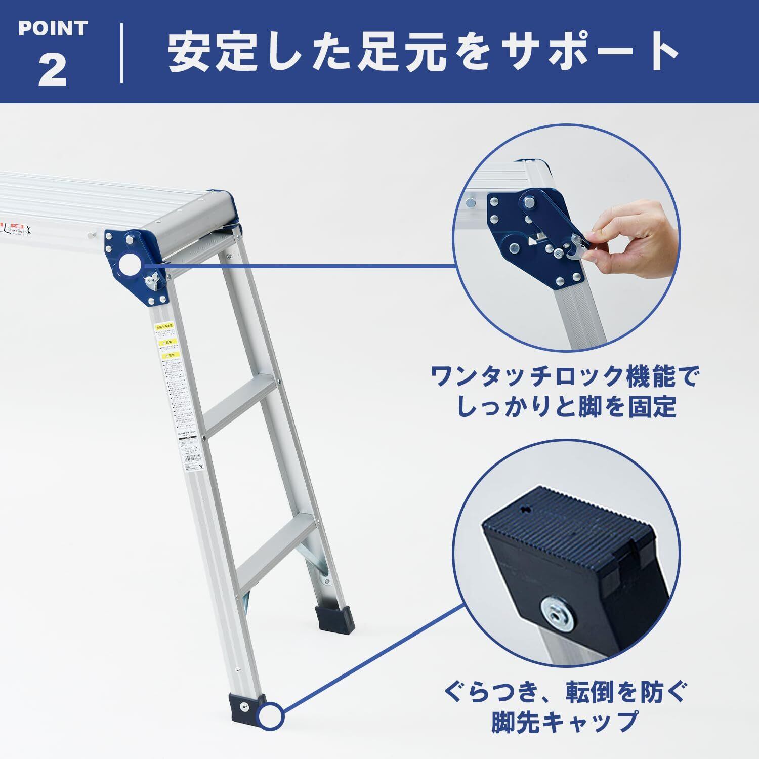 ● ワンタッチロック機能搭載! ● 安全性を第一に考えた設計で、簡単な操作でロックがかかります。作業中の突然の倒れやぐらつきを防ぎ、安定感をもたらします。忙しい時でも安心してお使いいただけるアイテムです。