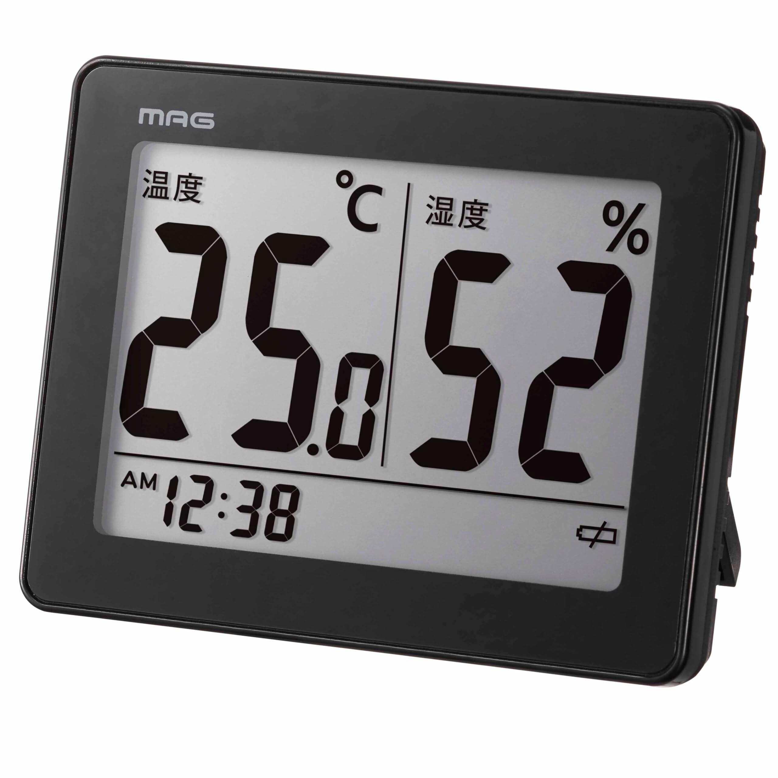 MAG(マグ) 温度計 湿度計 温湿度計 熱中症対策 大きくて見やすい デジタル ブラック スカイ 時計付き 置き掛け兼用 TH-109BK-Z