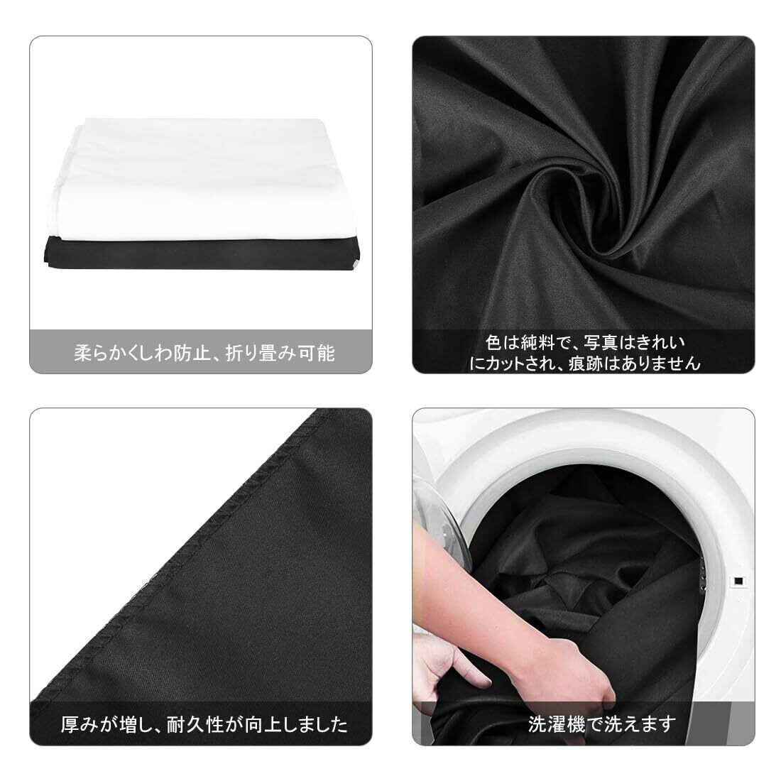 【お手入れ簡単】黒の背景布は折りたたんで輸送する際にシワが付くことがありますが、低温でアイロンをかけることで簡単に解消できます。また、汚れた場合は手洗いや洗濯機で丸洗いが可能です。そのため、清潔さを保ちながら手軽にお手入れができ、いつでもクリアで美しい背景を演出できます。
