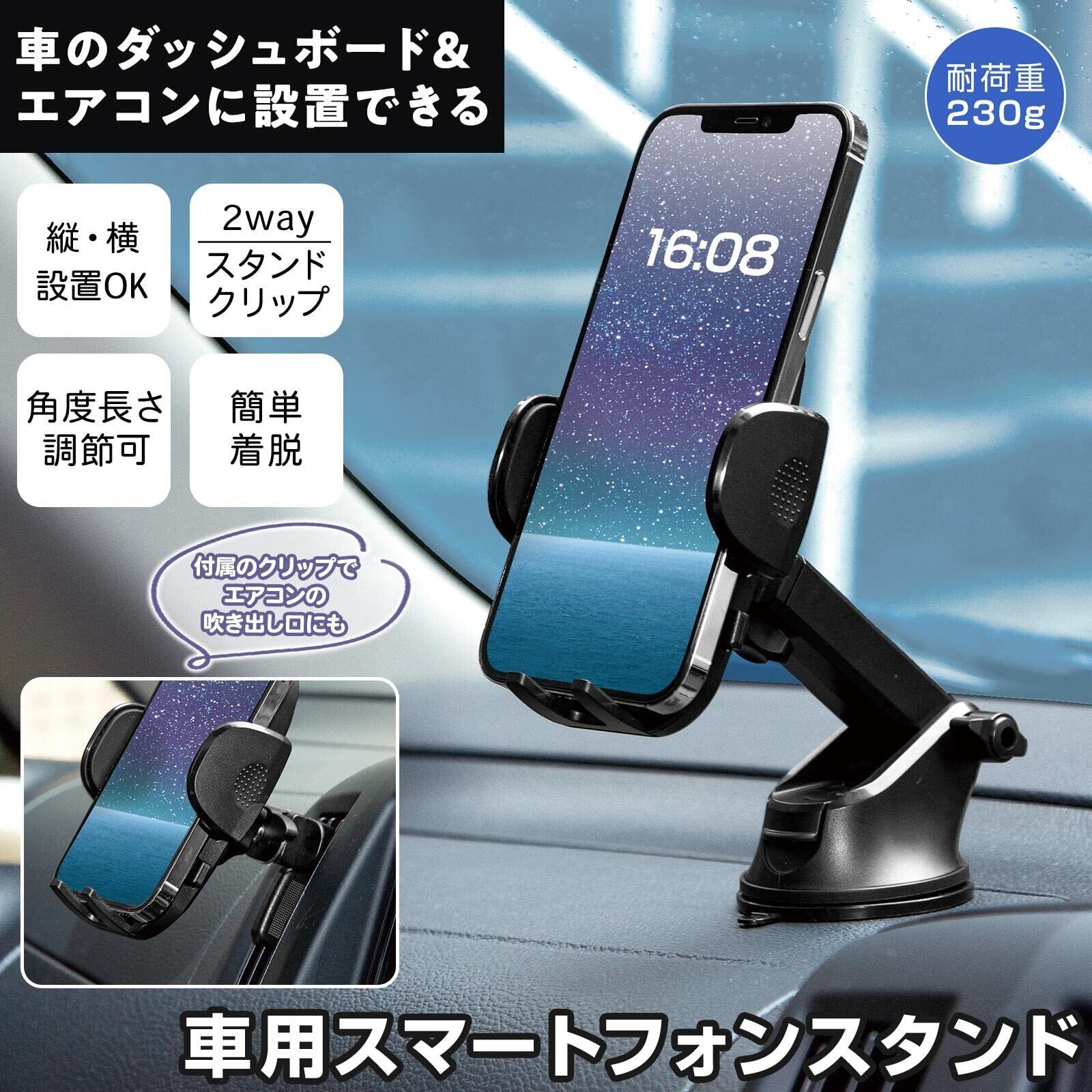 ダッシュボードまたは、付属パーツを取り換えてエアコン吹き出し口へ装着できるスマートフォンスタンド。