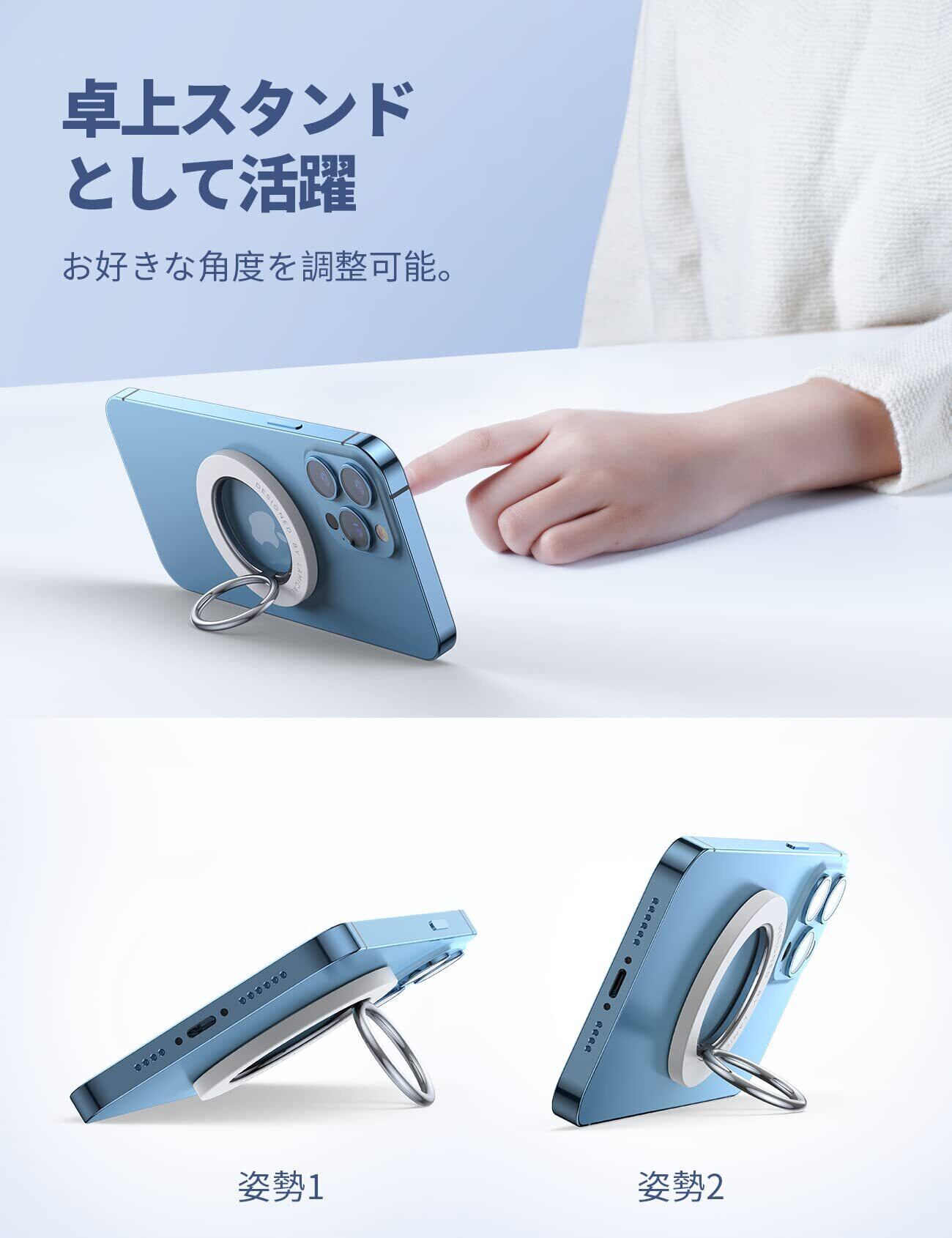 【強力磁力でしっかりと吸着】約1000gまでの荷重に耐える強力磁力です。iPhone 17/16/15/14/13シリーズをしっかりと吸着できます。マグネット式スマホリングで、iPhone MagSafe シリーズ本体やMagSafe搭載ケースに簡単に装着できます。また、マグネットなので跡を残さず取り外し可能です。テープ跡や糊残りを気にせずお使いのスマホをきれいな状態でご利用いただけます。