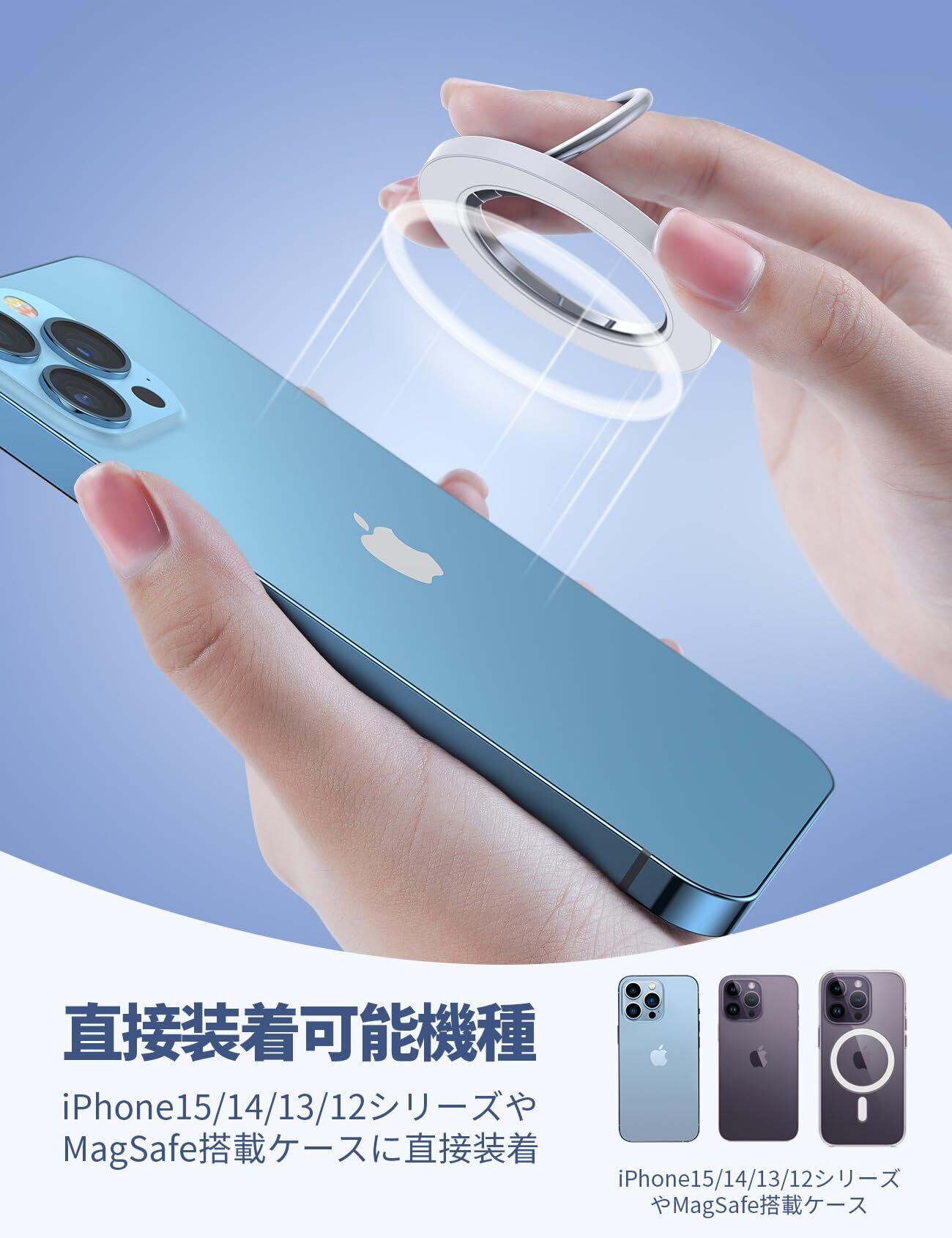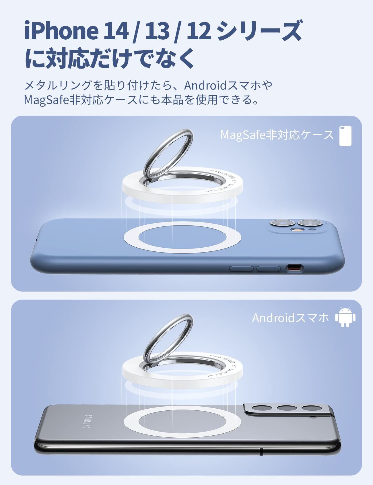 【対応機種】iPhone 2025, iPhone 17, iPhone 17 Pro, iPhone Air, iPhone 16, iPhone 16Plus, iPhone 16Pro, iPhone 16Pro Max, iPhone 15, iPhone 15Plus, iPhone 15Pro, iPhone 15Pro Max, iPhone 14, iPhone 14pro, iPhone 14pro max, iPhone 14Plus, iPhone 13, iPhone 13 Pro, iPhone 13 Pro Max, iPhone 13, iPhone 13 mini, iPhone 12, 12 Pro, 12 Pro Max, 12 miniの本体やMagSafe搭載ケースに直接装着可能です。付属されたメタルリングを利用すると、磁力がもっと強くなります。