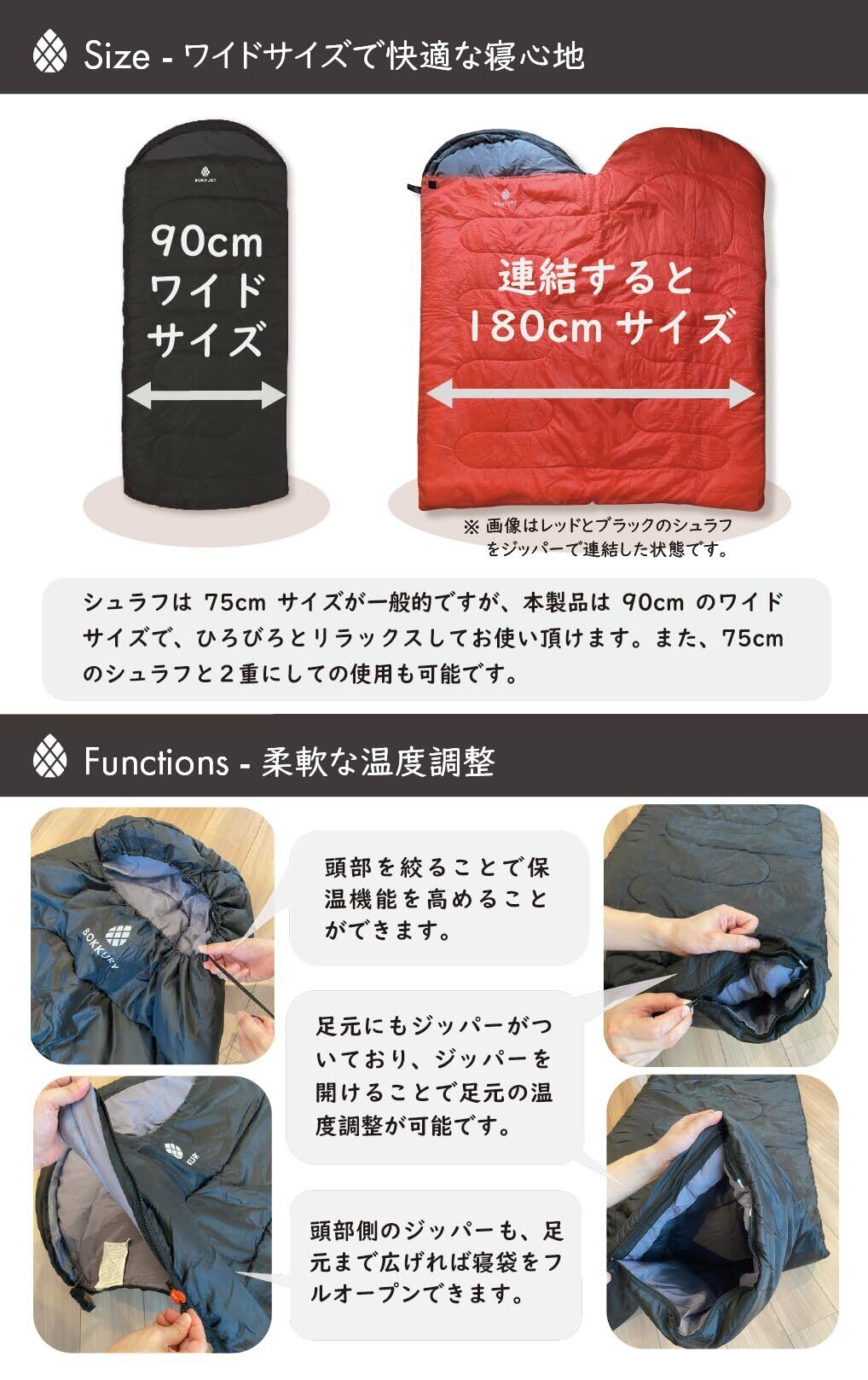 ● ワイドなサイズでゆったり快適! ● 約85cmのワイドサイズに設計されており、体をしっかり包み込みます。肩や足元に余裕があるため、快適に眠ることができ、動きやすさも確保されています。