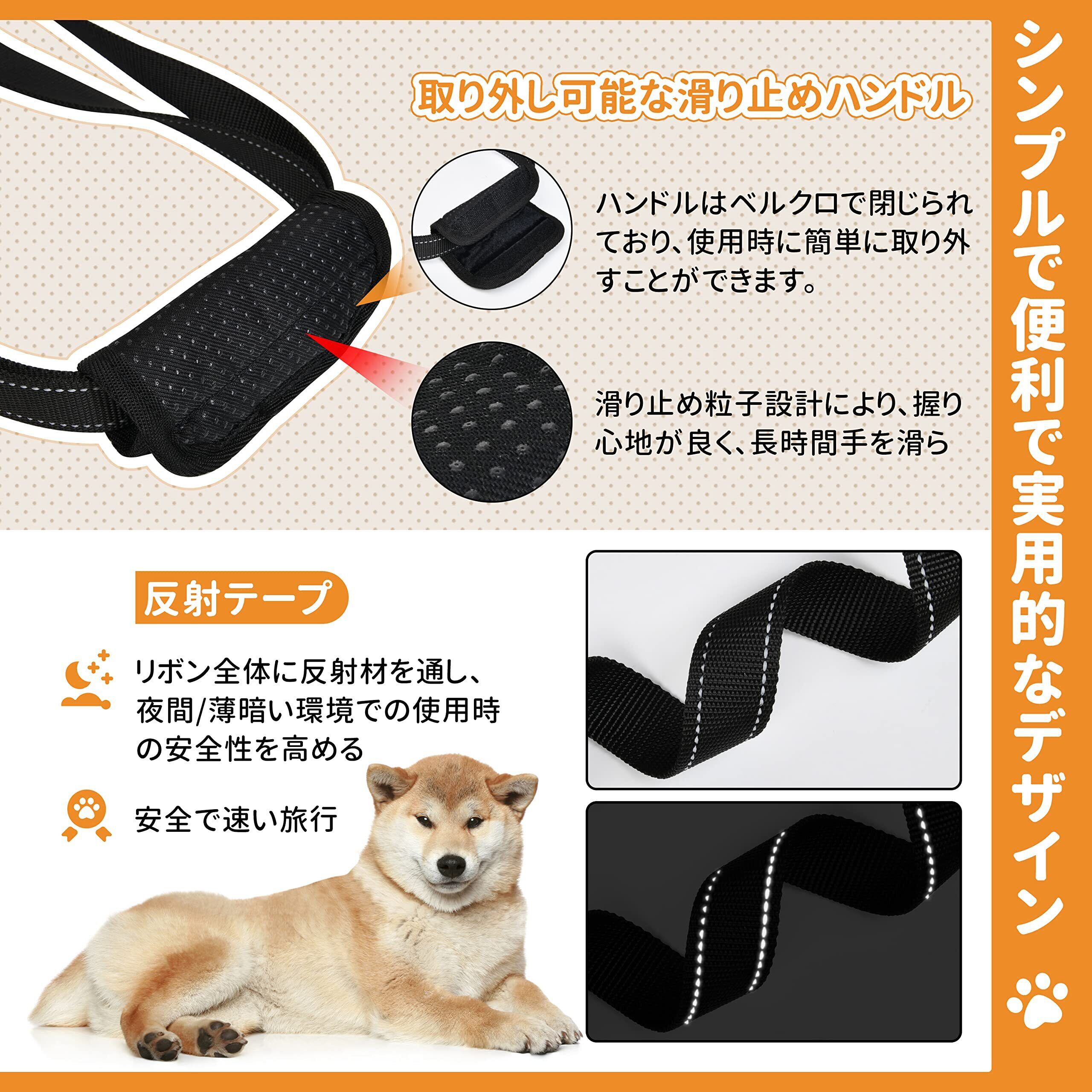 【反射デザインと取り外し可能な滑り止め持ち手】歩行補助ハーネスの紐部分に光に反射する素材が使われています。夜間や薄暗い環境で使用するときに犬の安全を保護するために安全率を高めるように設計されています。 ハンドルは使用中に簡単に取り外せるベルクロで閉じられていると同時に、滑りにくい粒子設計が採用されているため、グリップが快適で、長時間使用しても滑りません。