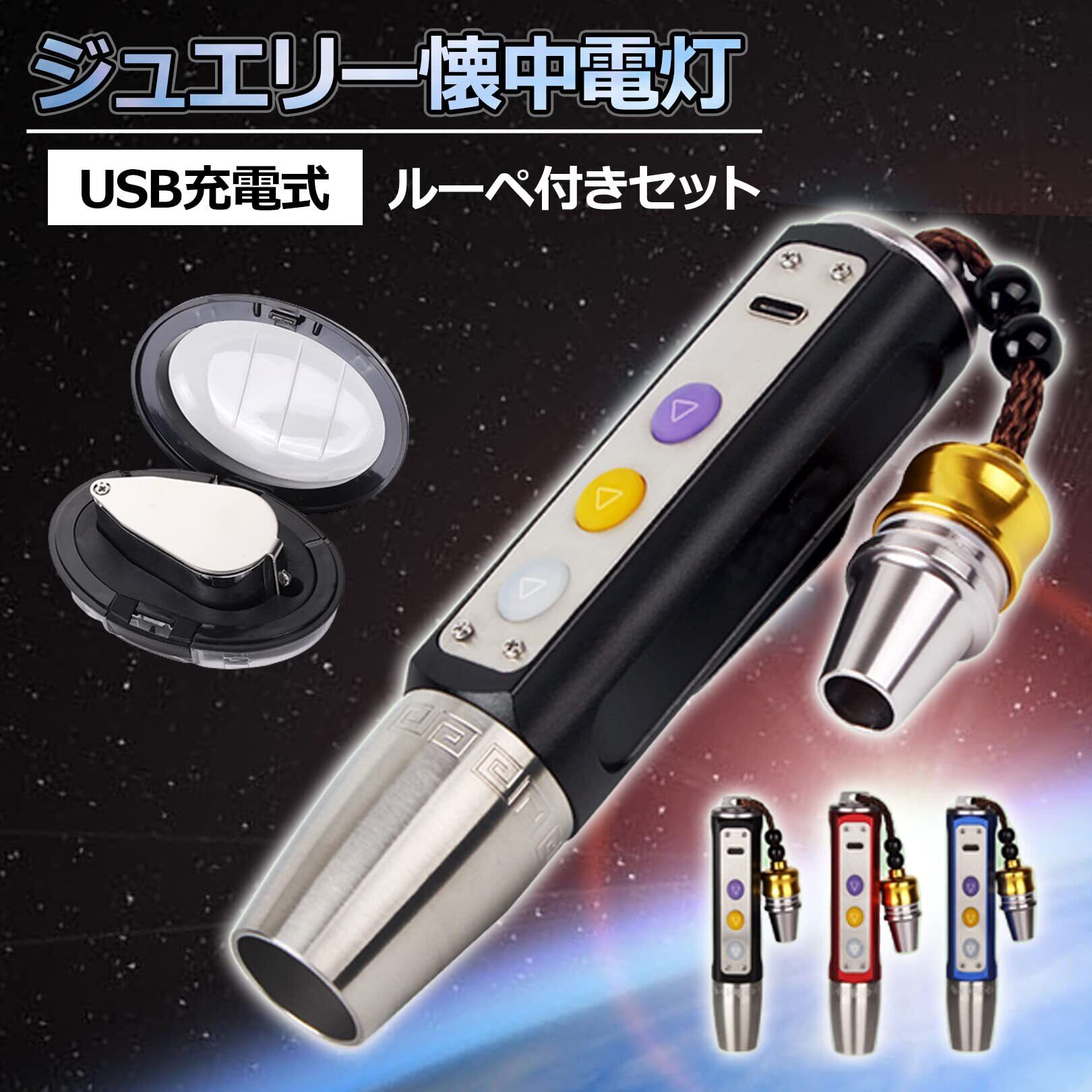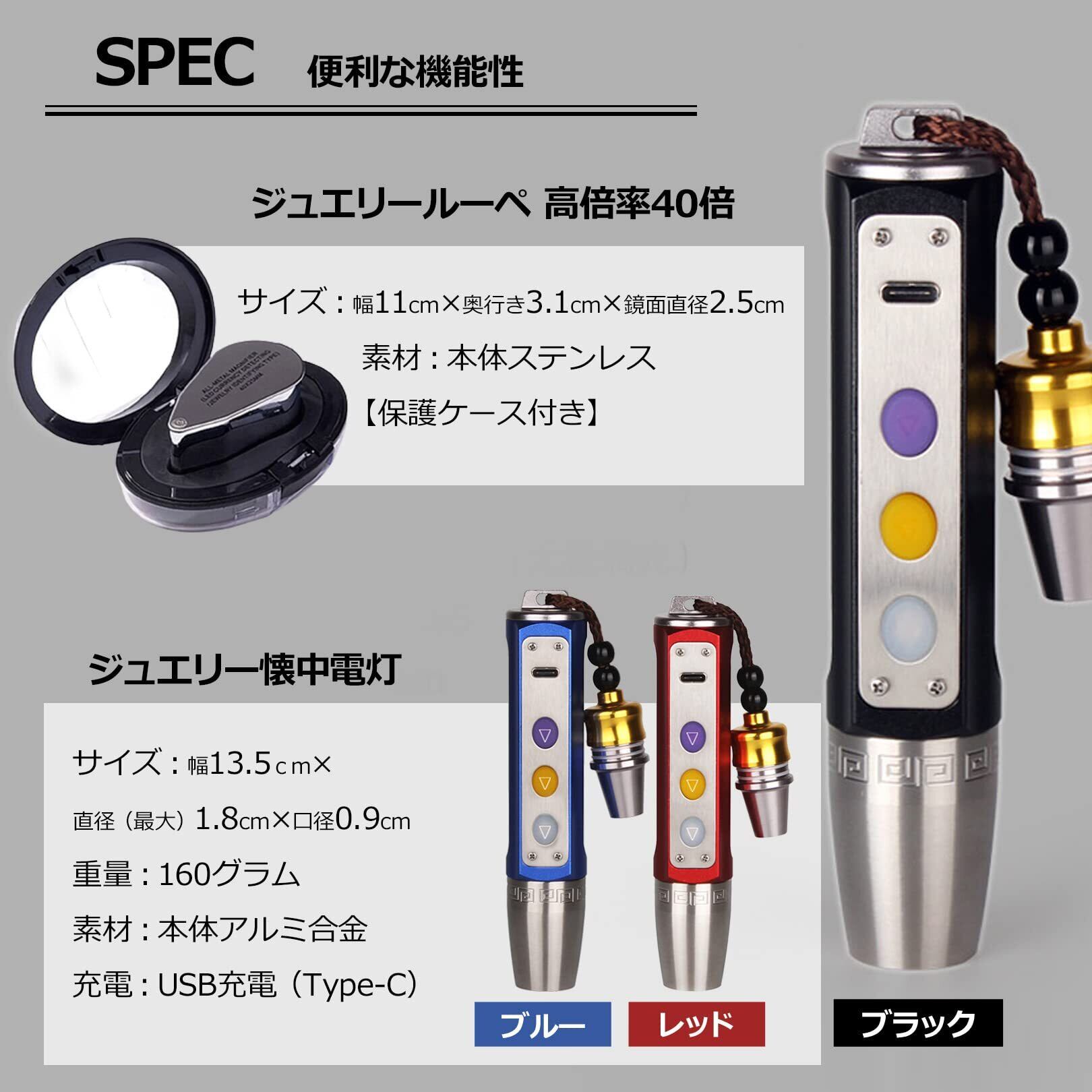 【ジュエリー懐中電灯】サイズ:幅13.5×直径(最大)×1.8×口径0.9cm、素材:本体アルミ合金、LED:白/黄/紫(UV)、電源:USB充電(Type-C)本体色:ブラック、ブルー、レッド【ルーペ】高倍率40倍、幅11×奥行き(最大)3.1×鏡面直径2.5cm、本体ステンレス、LEDライト、折り畳み式、保護ケース付き、使用電池:LR1130/3個※ルーペは40倍の高拡大率の製品の為、新聞や文庫本の文字を読むことには適しませんのでご注意ください。※モニターの環境により、色の見え方に若干差が生じる場合がございます。